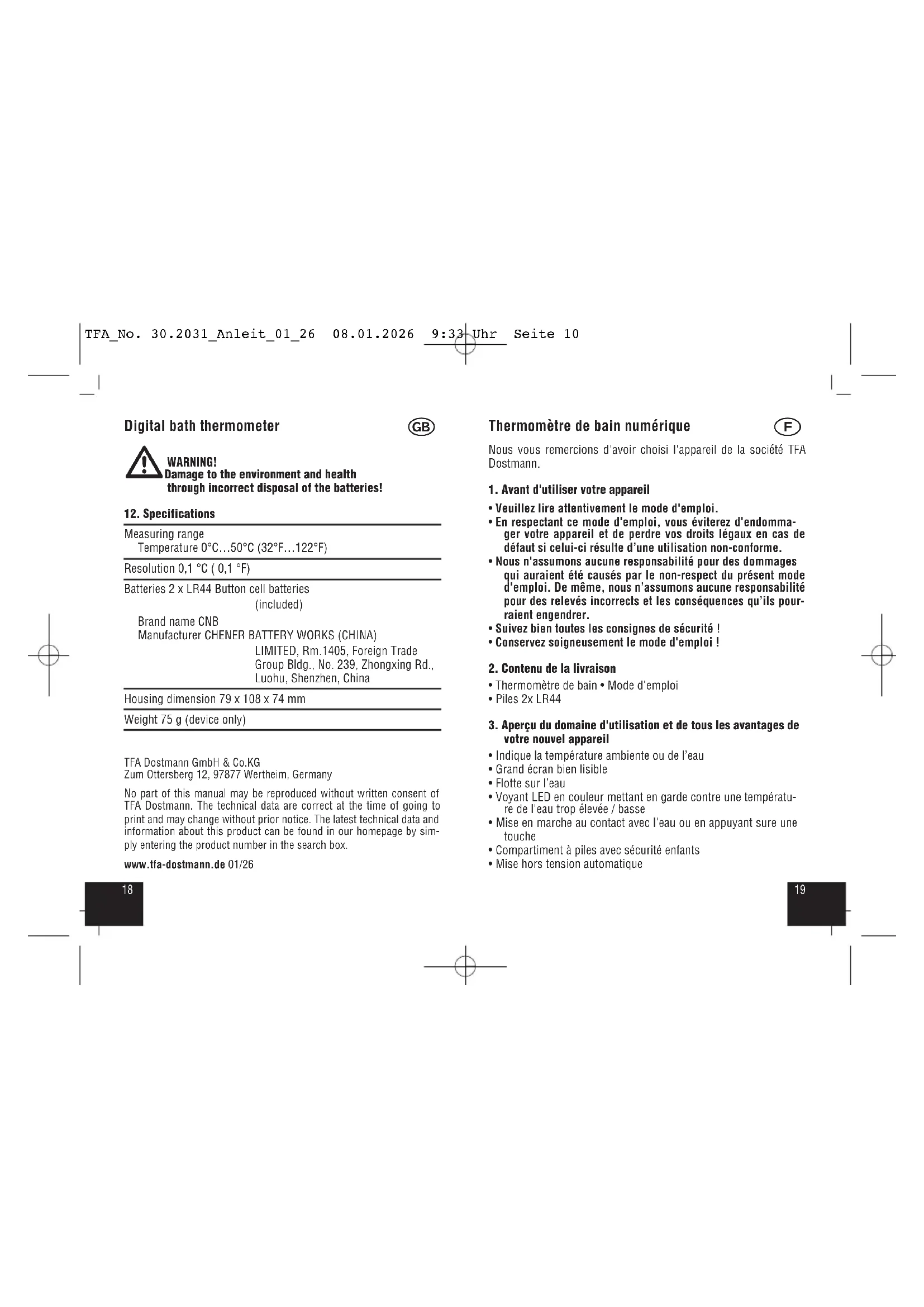 Plage de mesure température de 0 °C à 50 °C (de 32 °F à 122 °F) Résolution 0,1°C (0,1°F) Piles Piles bouton 2x LR44 (incluses) Marque CNB Fabricant CHENER BATTERY WORKS (CHINA) LIMITED, Rm.1405, Foreign Trade Group Bldg., No. 239, Zhongxing Rd., Luohu, Shenzhen, Chine Dimensions du boîtier 79 x 108 x 74 mm Poids 75 g (appareil seulement) TFA Dostmann GmbH & Co.KGZum Ottersberg 12, 97877 Wertheim, AllemagneLa reproduction, même partielle, du présent mode d'emploi est stricte-ment interdite sans l'accord explicite de TFA Dostmann. Les caractéristi-ques techniques de ce produit ont été actualisées au moment de l'im-pression et peuvent être modifiées sans avis préalable. Les dernièresdonnées techniques et les informations concernant votre produit peuventêtre consultées en entrant le numéro de l'article sur notre site Internet.www.tfa-dostmann.de 01/26 Termometro digitale da bagno