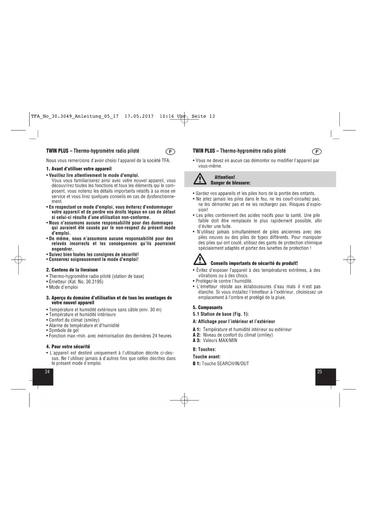 - Pour effacer toutes les valeurs, appuyez sur la touche RESET à l'aide d’un objet pointu ou retirez les piles. TFA_No_30.3049_Anleitung_05_17 17.05.2017 10:16 Uhr Seite 142928 TWIN PLUS – Thermo-hygromètre radio piloté