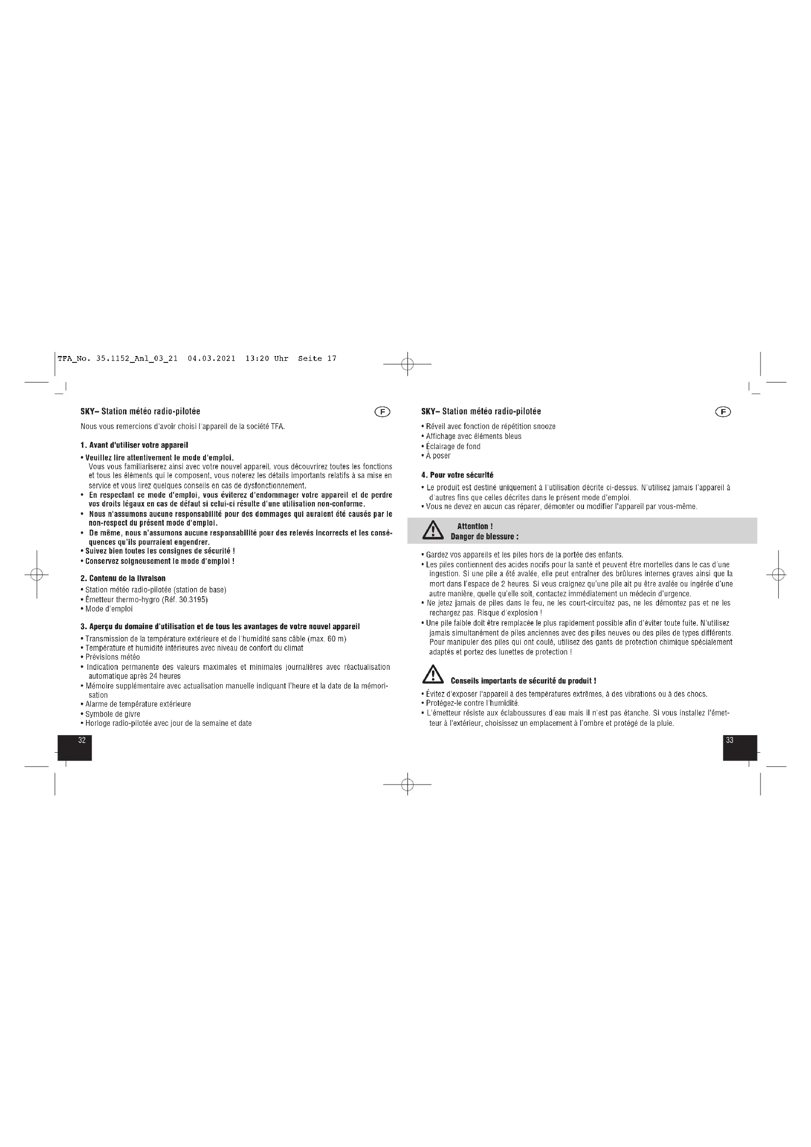 MODE D'EMPLOI Sky 35.1152.02 TFA