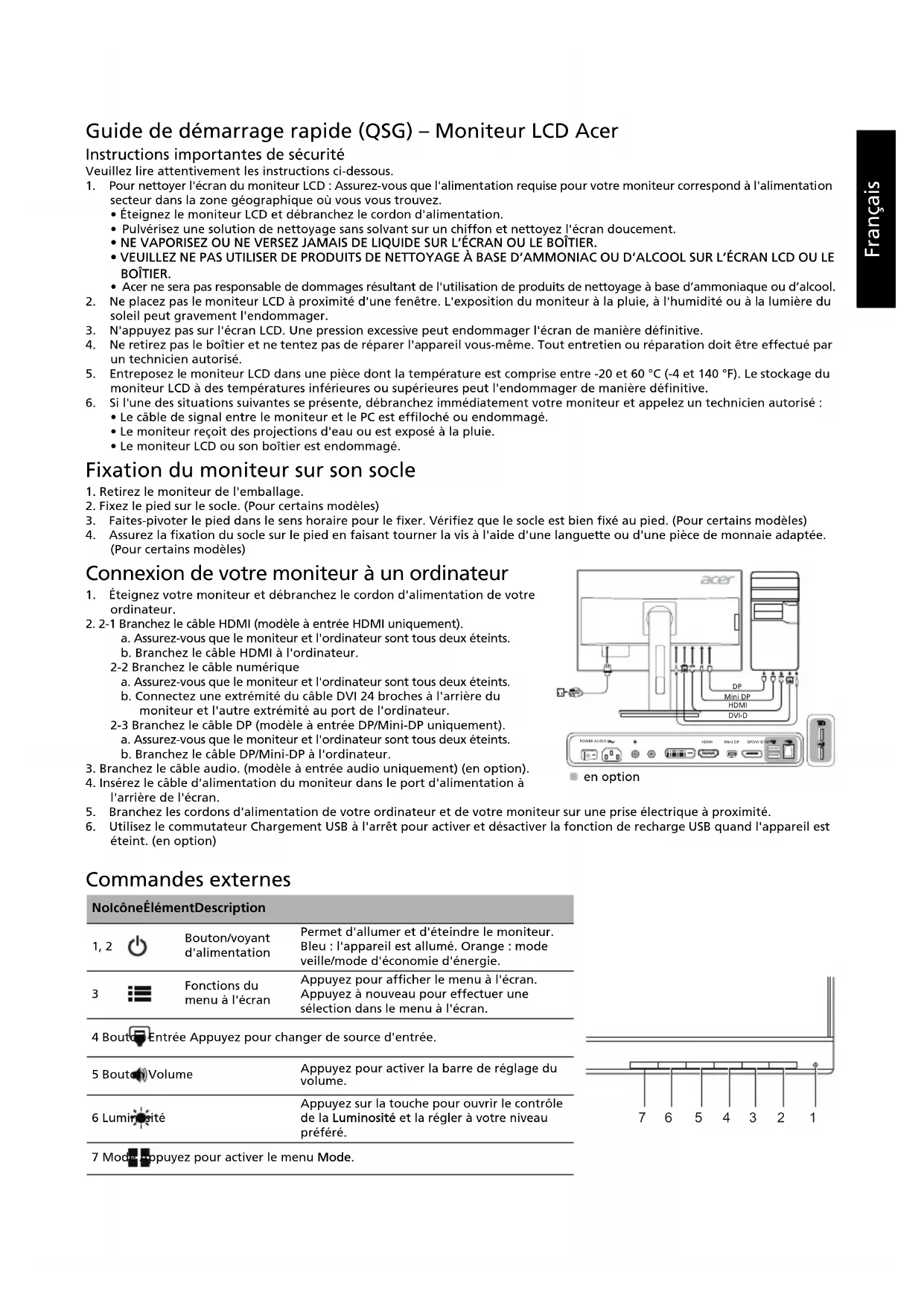 6. Utilisez le commutateur Chargement USB à l'arrêt pour activer et désactiver la fonction de recharge USB quand l'appareil est éteint. (en option) Commandes externes No Icône Élément Description 1, 2 Bouton/voyant d'alimentationPermet d'allumer et d'éteindre le moniteur. Bleu : l'appareil est allumé. Orange : mode veille/mode d'économie d'énergie. Fonctions du menu à l'écranAppuyez pour afficher le menu à l'écran. Appuyez à nouveau pour effectuer une sélection dans le menu à l'écran.4 Bouton Entrée Appuyez pour changer de source d'entrée.5 Bouton VolumeAppuyez pour activer la barre de réglage du volume.6 LuminositéAppuyez sur la touche pour ouvrir le contrôle de la Luminosité et la régler à votre niveau préféré.7 Mode Appuyez pour activer le menu Mode. HDMI DVI-DMini DP POWER AUDIO INHDMI DPDVI-D INMini DP en option 1234567Français Réglementation et consignes de sécurité Avis FCC Cet appareil a été testé et les résultats de ces tests ont révélé qu'il respecte les limites d'un appareil numérique de classe B, en conformité avec la réglementation de la section 15 de la FCC. Ces limites sont conçues pour offrir une protection raisonnable contre les interférences nuisibles dans une installation résidentielle. Cet appareil produit, utilise et peut émettre un rayonnement électromagnétique et, s'il n'est pas installé et utilisé conformément à aux instructions, peut provoquer des interférences nuisibles aux communications radio. Cependant, il est impossible de garantir qu'aucune interférence ne se produira dans certaines installations. Si cet appareil provoque des interférences qui affectent la réception d'un poste de radio ou de télévision, ce que vous pouvez déterminer en éteignant puis en allumant l'appareil, nous vous encourageons à essayer de les corriger en employant au moins l'une des méthodes suivantes : Réorientez ou déplacez l'antenne de réception. Éloignez l'appareil du récepteur. Branchez l'appareil sur une prise située sur un circuit différent de celui sur lequel le récepteur est branché. Consultez le revendeur ou un technicien en radio et télévision expérimenté pour obtenir une assistance. Déclaration de conformité CE Acer, Inc. déclare par la présente que cet appareil est conforme aux obligations essentielles et autres clauses pertinentes de la directive CEM 2014/30/UE, de la directive sur les faibles voltages 2014/35/UE, de la directive RoHS 2011/65/UE et de la directive 2009/125/CE concernant l'établissement d'un cadre fixant des exigences d'écoconception pour les produits liés à l'énergie. Avis : Afin d’éviter d’endommager le moniteur, ne soulevez pas le moniteur par sa base. Avis : Câbles blindés Toutes les connexions vers d'autres appareils informatiques doivent être établies à l'aide de câbles blindés afin d'assurer la conformité aux réglementations EMC. Avis : Périphériques Seuls des périphériques (appareils d'entrée/sortie, terminaux, imprimantes, etc.) certifiés conformes aux limites de la classe B doivent être connectés à cet appareil. Toute utilisation avec des périphériques non certifiés est susceptible d'entraîner des perturbations de la réception radio ou télévision. Attention Les changements ou modifications qui ne seraient pas expressément approuvés par le fabricant peuvent rendre nul le droit de l'utilisateur à faire fonctionner ce produit, droit qui lui est accordé par la Federal Communications Commission. Conditions de fonctionnement Cet appareil est conforme à la partie 15 de la réglementation de la FCC. Il peut être utilisé sous les deux conditions suivantes : (1) cet appareil ne doit pas causer d'interférences nuisibles, et (2) cet appareil doit accepter toute interférence reçue, notamment celles susceptibles de causer un fonctionnement indésirable. Avis : Utilisateurs canadiens Cet appareil numérique de classe B est conforme à la norme canadienne ICES-003. Remarque à l'intention des utilisateurs canadiens Cet appareil numérique de la classe B est conforme à la norme NMB-003 du Canada. Mise au rebut des équipements usagés par les utilisateurs faisant partie de ménages privés dans l'Union européenne Ce symbole sur le produit ou sur son emballage indique que le produit ne doit pas être jeté avec les autres ordures ménagères. Il relève donc de votre responsabilité de recycler ce déchet d'équipement électronique en le remettant à un point de collecte prévu pour les déchets électriques et électroniques. Le tri, l'élimination et le recyclage séparés de vos équipements usagés permettent de préserver les ressources naturelles et de s'assurer que ces équipements sont recyclés dans le respect de la santé humaine et de l'environnement. Pour plus d'informations quant aux lieux d'élimination des déchets d'équipements électriques, vous pouvez contacter votre mairie, le service local de traitement des ordures ménagères ou le commerçant auprès duquel vous avez acheté le produit. Message d'avertissement concernant l'aimant Certains dispositifs électroniques, notamment les disques durs, les périphériques USB, les tablettes, les ordinateurs portables, les téléphones portables, les montres, les écouteurs, les haut-parleurs, les cartes bancaires et les cartes d'identité magnétiques, sont sensibles aux champs magnétiques et peuvent être endommagés de manière permanente ou désactivés temporairement s'ils sont exposés à un champ magnétique trop puissant. Il est préférable de ne pas placer les appareils électroniques à proximité de la zone magnétique du socle du moniteur ou directement sur celle-ci. MagnetFrançais CARACTÉRISTIQUES Vous pouvez trouver les manuels et autres documents pour votre produit Acer sur le site Web d'assistance Acer officiel.