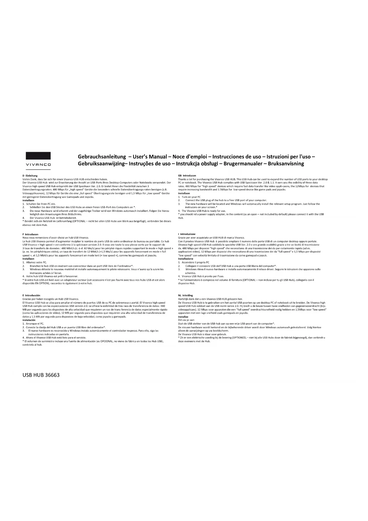 - you should find a power supply adapter, in the content (as an option – not included by default) please connect it with the USB Hub. F Introduction Nous vous remercions d’avoir choisi un hub USB Vivanco. Le hub USB Vivanco permet d’augmenter multiplier le nombre de ports USB de votre ordinateur de bureau ou portable. Ce hub USB Vivanco « high speed » est conforme à la spécification version 2.0. Il vous offre toute la sou-plesse offerte par le support de 3 taux de transferts de données : 480 Mbit/s (c.-à-d. 60 Mo/s) pour les périphé-riques rapides supportant le mode « high speed » (p. ex. les périphériques vidéo), un taux de transfert de 12 Mbit/s (=1,5 Mo/s) pour les appareils fonctionnant en mode « full speed », et 1,5 Mbit/s pour les appareils fonctionnant en mode lent (« low speed »), comme les gamepads et joysticks. Installation