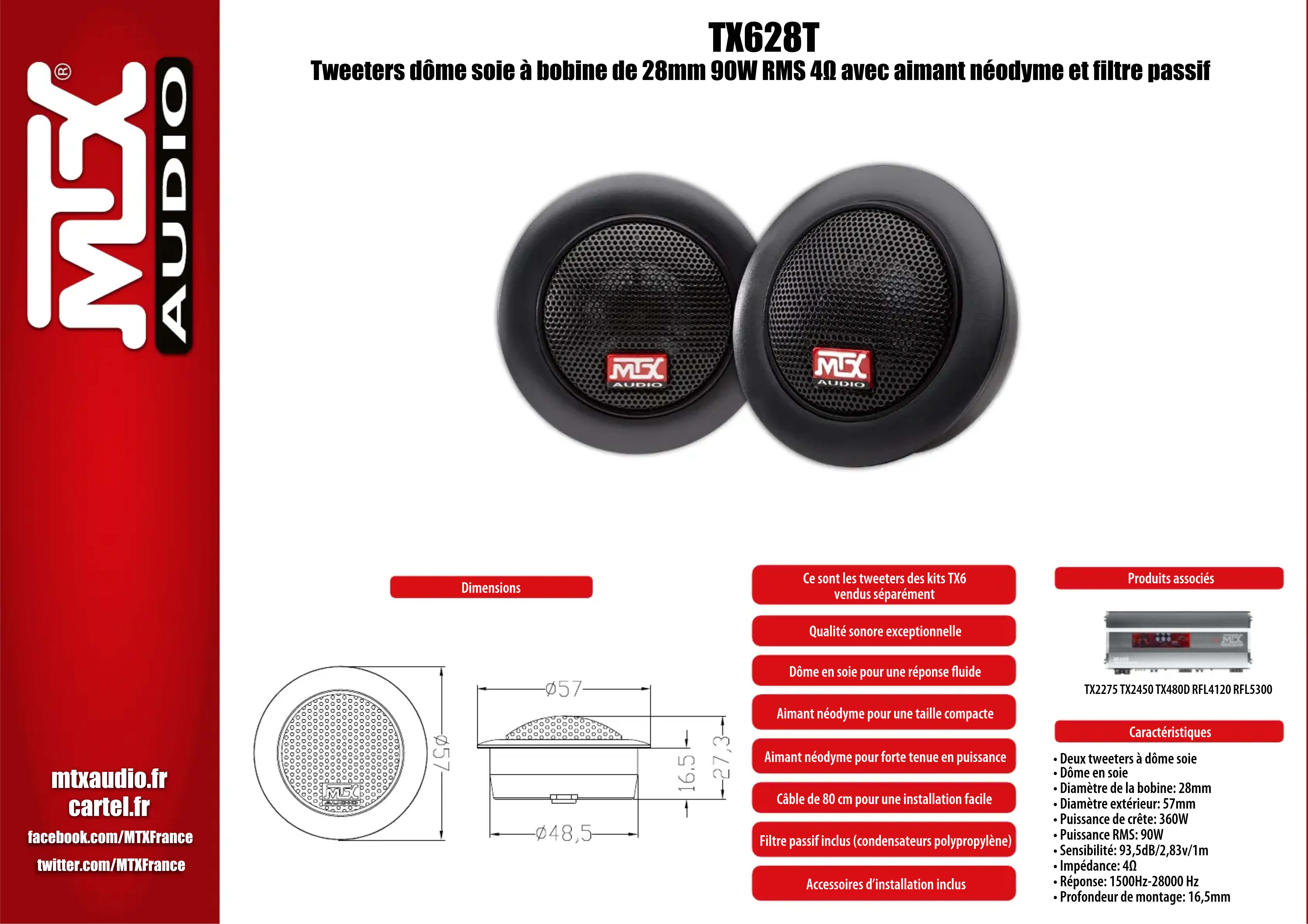 mtxaudio.fr cartel.fr facebook.com/MTXFrance twitter.com/MTXFrance TX628T Tweeters dôme soie à bobine de 28mm 90W RMS 4Ω avec aimant néodyme et filtre passif