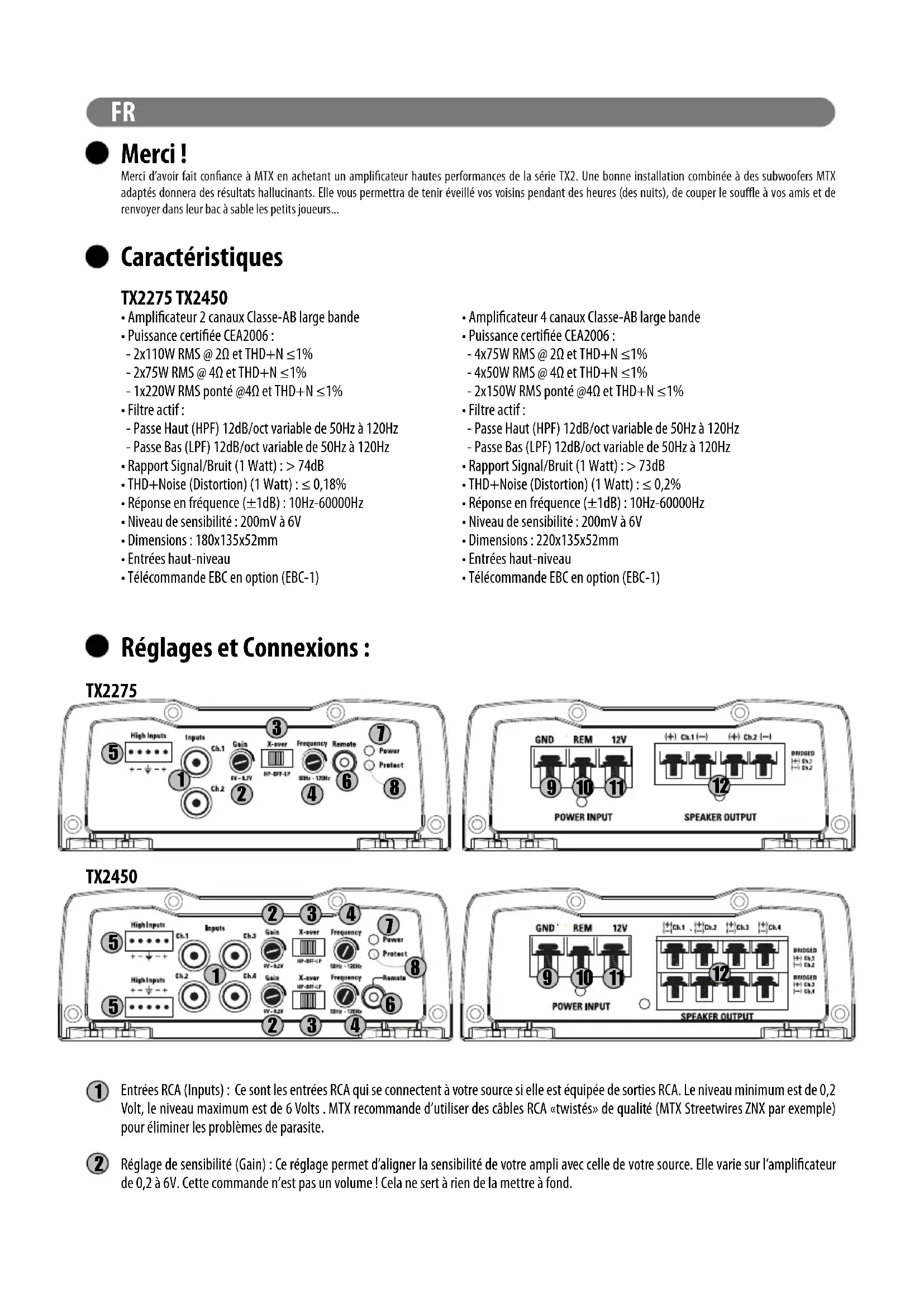 TX2450 TX2450 TX2275 TX2275 TX2275 TX2275 TX2450 Installation n°1 : 3-Channel system. Compo system @ front + subwoofer/ enclosure @ back. Installation n°2 4-Channel system Compo system @ front + coaxials @ back. Installation n°3 : 5-Channel system. Compo system @ front + coaxials @ back + subwoofer/enclosure system @ back Installation n°4 : 3-Channel system with multiple amps. Compo system @ front + dual subwoofer/enclosure system @ back Recommended subwoofers/enclosures : TR12-04, TR12AV, RTE12AS, RTF10AS, RT12AT, RT10AS, RT12AV Recommended speakers : any TR/TRC/TRS speakers, any TX2 speakers, any TX4 speakres, any RTC/RTS speakersFR TX2275 TX2450 Caractéristiques Entrées RCA (Inputs) : Ce sont les entrées RCA qui se connectent à votre source si elle est équipée de sorties RCA. Le niveau minimum est de 0,2 Volt, le niveau maximum est de 6 Volts . MTX recommande d’utiliser des câbles RCA «twistés» de qualité (MTX Streetwires ZNX par exemple) pour éliminer les problèmes de parasite. Réglage de sensibilité (Gain) : Ce réglage permet d’aligner la sensibilité de votre ampli avec celle de votre source. Elle varie sur l’amplificateur de 0,2 à 6V. Cette commande n’est pas un volume ! Cela ne sert à rien de la mettre à fond. Merci ! Merci d’avoir fait confiance à MTX en achetant un amplificateur hautes performances de la série TX2. Une bonne installation combinée à des subwoofers MTX adaptés donnera des résultats hallucinants. Elle vous permettra de tenir éveillé vos voisins pendant des heures (des nuits), de couper le souffle à vos amis et de renvoyer dans leur bac à sable les petits joueurs...