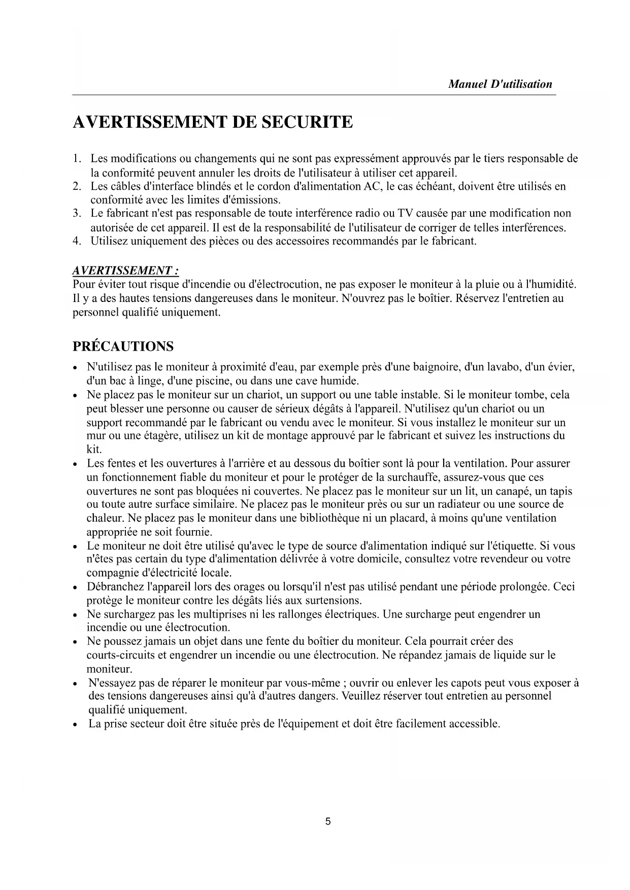 UAVERTISSEMENT : Pour éviter tout risque d'incendie ou d'électrocution, ne pas exposer le moniteur à la pluie ou à l'humidité. Il y a des hautes tensions dangereuses dans le moniteur. N'ouvrez pas le boîtier. Réservez l'entretien au personnel qualifié uniquement. PRÉCAUTIONS N'utilisez pas le moniteur à proximité d'eau, par exemple près d'une baignoire, d'un lavabo, d'un évier, d'un bac à linge, d'une piscine, ou dans une cave humide. Ne placez pas le moniteur sur un chariot, un support ou une table instable. Si le moniteur tombe, cela peut blesser une personne ou causer de sérieux dégâts à l'appareil. N'utilisez qu'un chariot ou un support recommandé par le fabricant ou vendu avec le moniteur. Si vous installez le moniteur sur un mur ou une étagère, utilisez un kit de montage approuvé par le fabricant et suivez les instructions du kit. Les fentes et les ouvertures à l'arrière et au dessous du boîtier sont là pour la ventilation. Pour assurer un fonctionnement fiable du moniteur et pour le protéger de la surchauffe, assurez-vous que ces ouvertures ne sont pas bloquées ni couvertes. Ne placez pas le moniteur sur un lit, un canapé, un tapis ou toute autre surface similaire. Ne placez pas le moniteur près ou sur un radiateur ou une source de chaleur. Ne placez pas le moniteur dans une bibliothèque ni un placard, à moins qu'une ventilation appropriée ne soit fournie. Le moniteur ne doit être utilisé qu'avec le type de source d'alimentation indiqué sur l'étiquette. Si vous n'êtes pas certain du type d'alimentation délivrée à votre domicile, consultez votre revendeur ou votre compagnie d'électricité locale. Débranchez l'appareil lors des orages ou lorsqu'il n'est pas utilisé pendant une période prolongée. Ceci protège le moniteur contre les dégâts liés aux surtensions. Ne surchargez pas les multiprises ni les rallonges électriques. Une surcharge peut engendrer un incendie ou une électrocution. Ne poussez jamais un objet dans une fente du boîtier du moniteur. Cela pourrait créer des courts-circuits et engendrer un incendie ou une électrocution. Ne répandez jamais de liquide sur le moniteur. N'essayez pas de réparer le moniteur par vous-même ; ouvrir ou enlever les capots peut vous exposer à des tensions dangereuses ainsi qu'à d'autres dangers. Veuillez réserver tout entretien au personnel qualifié uniquement. La prise secteur doit être située près de l'équipement et doit être facilement accessible.Manuel D'utilisation