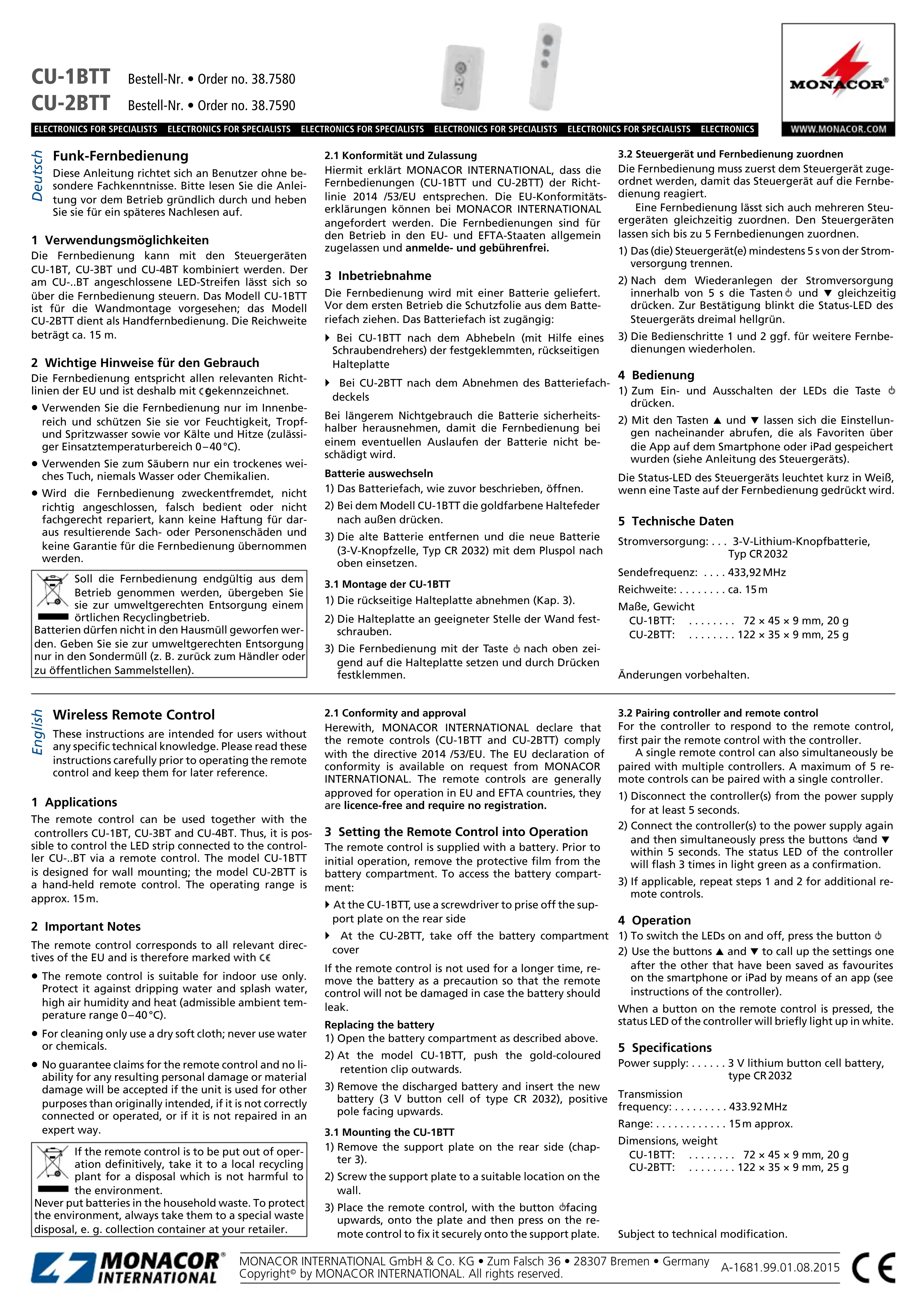 CU2BTT - Télécommande Monacor - Notice d'utilisation et mode d'emploi gratuit