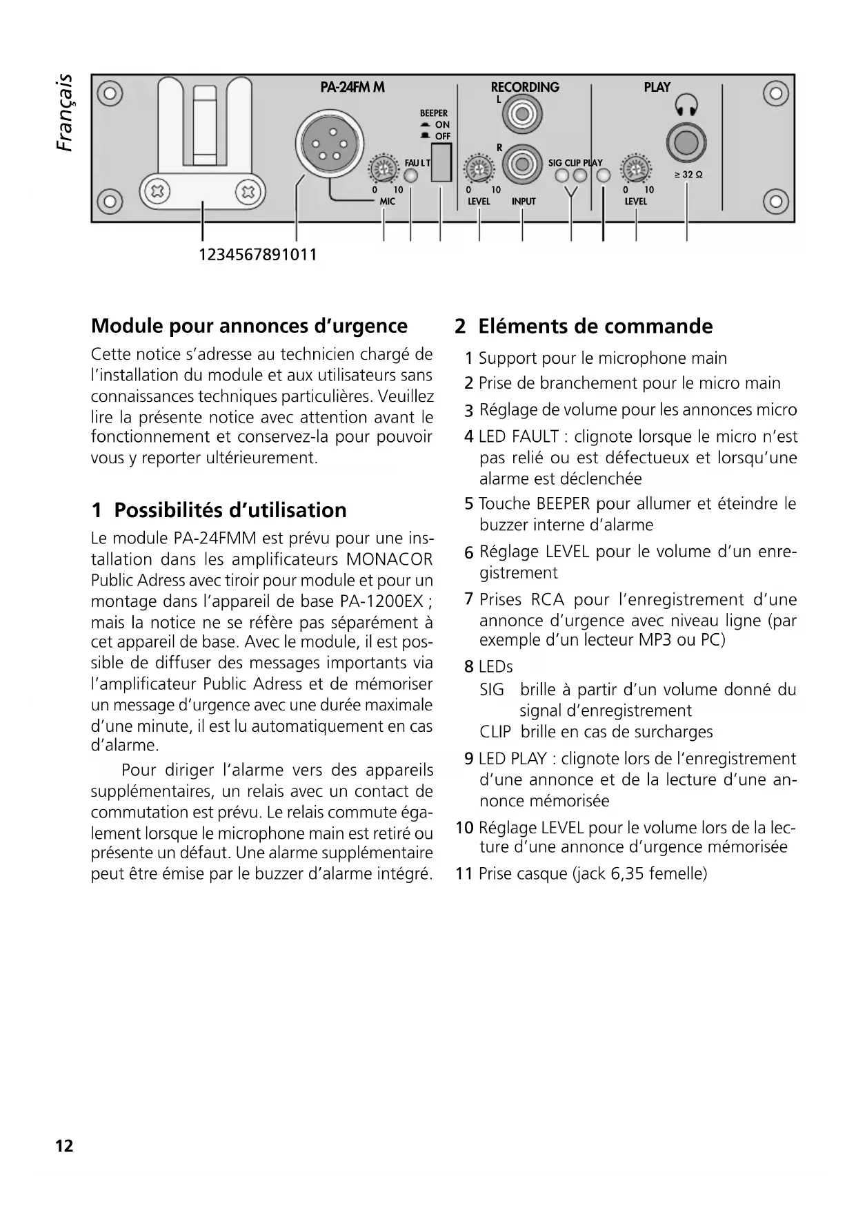 Français Français Page Module pour annonces d’urgence Cette notice s’adresse au technicien chargé de l’installation du module et aux utilisateurs sans connaissances techniques particulières. Veuillez lire la présente notice avec attention avant le fonctionnement et conservez-la pour pouvoir vous y reporter ultérieurement. 1 Possibilités d’utilisation Le module PA-24FMM est prévu pour une ins- tallation dans les amplificateurs MONACOR Public Adress avec tiroir pour module et pour un montage dans l’appareil de base PA-1200EX; mais la notice ne se réfère pas séparément à cet appareil de base. Avec le module, il est pos- sible de diffuser des messages importants via l’amplificateur Public Adress et de mémoriser un message d’urgence avec une durée maximale d’une minute, il est lu automatiquement en cas d’alarme. Pour diriger l’alarme vers des appareils supplémentaires, un relais avec un contact de commutation est prévu. Le relais commute éga- lement lorsque le microphone main est retiré ou présente un défaut. Une alarme supplémentaire peut être émise par le buzzer d’alarme intégré. 2 Eléments de commande 1 Support pour le microphone main 2 Prise de branchement pour le micro main