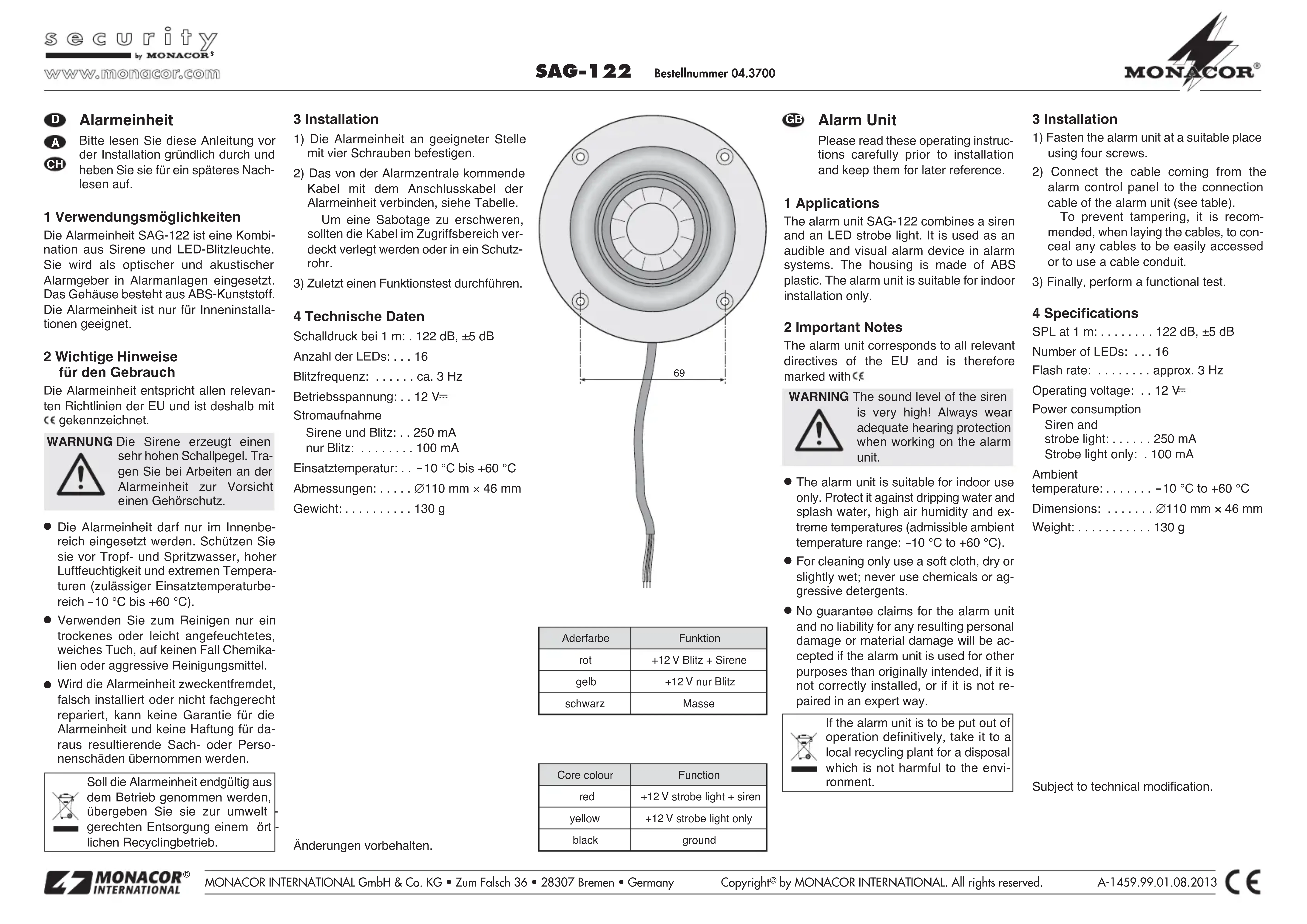Aderfarbe Funktion rot +12 V Blitz + Sirene gelb +12 V nur Blitz schwarz Masse Core colour Function red +12 V strobe light + siren yellow +12 V strobe light only black groundUnité dʼalarme Veuillez lire la présente notice avec attention avant lʼinstallation et conservez-la pour pouvoir vous y reporter ultérieurement. 1 Possibilités dʼutilisation Lʼunité dʼalarme SAG-122 est la combinai- son dʼune sirène et dʼune lampe à éclairs à LEDs, elle est utilisée dans une installation dʼalarme comme avertisseur optique et acoustique dʼalarme. Le boîtier est en ABS. Lʼunité dʼalarme nʼest conçue que pour ins- tallation en intérieur. 2 Conseils importants dʼutilisation Lʼunité dʼalarme répond à toutes les direc- tives nécessaires de lʼUnion européenne et porte donc le symbole .