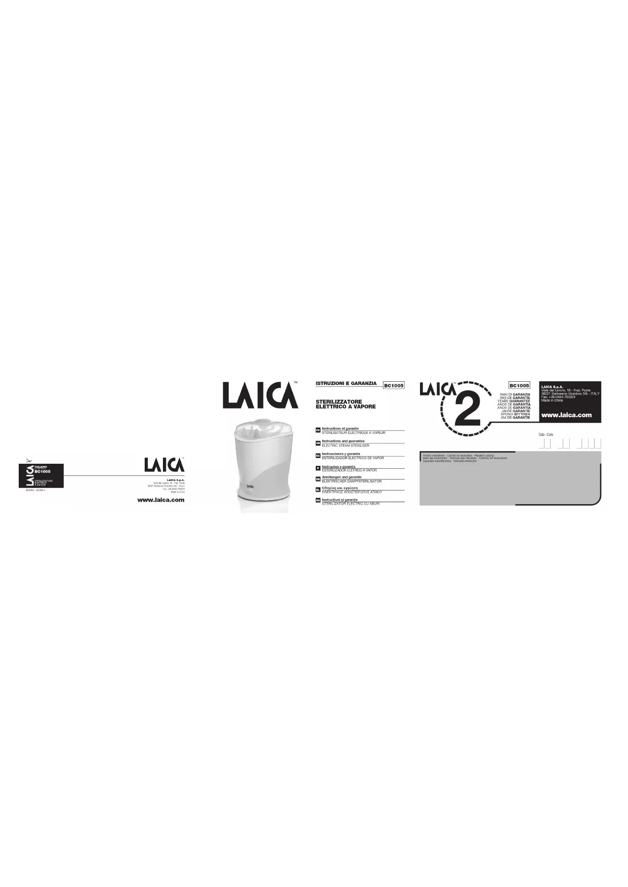 - vérifier que dans le bac pour l’eau ait été versée la quantité correcte d’eau (60 ml) - vérifier le charge d’accessoires introduits dans le stérilisateur, un charge léger prolonge le cycle de stérilisation. CARACTERISTIQUES TECHNIQUES Tension 220-240V AC 50 HZ 400 W Attention! Lire attentivement le mode d’emploi Ce produit est indiqué pour en emploi domestique. La conformité, prouvée par le marquage CE indiqué sur le dispositif, est relative à la directive 2004/108 CEE concernant la compatibilité électromagnétique et à la 2006/95 CEE concernant le matériau électrique destiné à être utilisé dans certaines limites de tension. Ce produit est un instrument électronique qui a été vérifié pour garantir, à l’état actuel des connaissances techniques, soit de ne pas interférer avec d’autres appareils placés aux alentours (compatibilité électromagnétique) soit d’être sécurisé si utilisé selon les indications des instructions pour l’emploi. En cas de comportements anormales du dispositif, ne pas prolonger l’emploi et éventuellement contacter directement le producteur. PROCÉDURE D’ÉLIMINATION (Dir. 2012/19/Ue - WEEE) Le symbole placé sur le fond de l’appareil indique la récolte séparée des appareils électriques et électroniques. A la fin de la vie utile de l’appareil, il ne faut pas l’éliminer comme déchet municipal solide mixte; il faut l’éliminer chez un centre de récolte spécifique situé dans votre zone ou bien le rendre au distributeur au moment de l’achat d’un nouveau appareil du même type et prévu pour les mêmes fonctions. Cette procédure de récolte séparée des appareils électriques et électroniques se réalise dans une vision d’une politique de sauvegarde, protection et amélioration de la qualité de l’environnement et pour éviter des effets potentiels sur la santé humaine dus à la présence de substances dangereuses dans ces appareils ou bien à un emploi non autorisé d’elles ou de leurs parties. Attention! Une élimination incorrecte des appareils électriques pourrait impliquer des pénalités. GARANTIE Cet appareil est garanti pour une durée de 2 ans à partir de la date d’achat qui doit apparaître sur le tampon et la signature du revendeur et sur le reçu fiscal ci-joint que vous garderez avec soin. Cette période est conforme à la législation en vigueur et s’applique seulement au cas où le consommateur soit un sujet particulier. Les produits Laica sont projetés pour un emploi à la maison et on ne permet pas son emploi dans les locaux publiques. La garantie couvre uniquement les défauts de production et n’est pas valable si les dommages sont causés par des événements accidentels, par une utilisation incorrecte, par négligence ou par utilisation impropre du produit. Utiliser uniquement les accessoires fournis; l’utilisation d’accessoires divers peut entraîner l’annulation de la garantie. N’ouvrir en aucun cas l’appareil; en cas d’ouverture ou d’endommagement, la garantie sera annulée définitivement. La garantie n’est pas valide pour les pièces soumises à usure suite à leur emploi et aux batteries lorsqu’elles sont fournies en dotation. Une fois écoulés 2 ans dès la date d’achat, la garantie s’échoit; dans ce cas les interventions d’assistance technique seront réalisées sous paiement. Les informations sur les interventions d’assistance technique, soient elles en garantie ou sous paiement, pourront être demandées en contactant notre société à info@ laica.com. Aucune forme de contribution est due pour les réparations et les remplacements inclus dans les termes de la garantie. En cas de pannes, s’adresser à son revendeur; NE PAS expédier directement à LAICA. Toutes les interventions en garantie (incluses celles de remplacement du produit ou bien d’une de ses parties) ne prolongeront pas la durée de la période de garantie originale du produit remplacé. La maison constructrice décline toute responsabilité en cas d’éventuels dommages causés, directement ou indirectement, aux personnes, choses et animaux domestiques suite au manque d’attention à toutes les prescriptions indiquées sur le livret d’instruction et concernant, de manière particulière, les conseils relatifs à l’installation, l’utilisation et l’entretien de l’appareil. Il est faculté de la société Laica, qui est constamment engagée dans l’amélioration de ses produits, de modifier sans aucun avis au préalable totalement ou partiellement ses propres produits en relation avec la nécessité de production, sans que cela implique aucune responsabilité de la part de la société Laica ou de ses vendeurs.