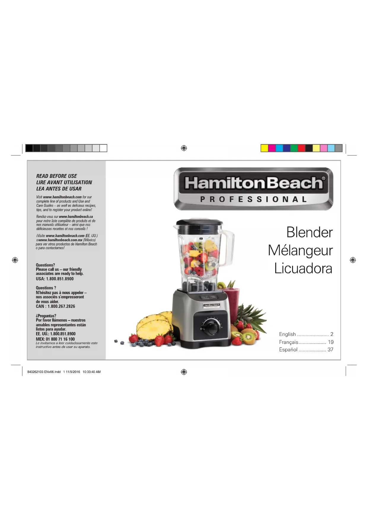 - Ceci est normal et fait partie du fonctionnement normal de ce mélangeur à haute performance afin d’assurer sa durabilité. Éteigner ( ) l’appareil et répéter la procédure jusqu’à ce que la consistance désirée soit atteinte. Dépannage (suite) 840262103 FRv03.indd 34 11/9/2016 10:37:21 AM35 Notes 840262103 FRv03.indd 35 11/9/2016 10:37:21 AM36 Hamilton Beach garantie limitée de 5 ans Cette garantie s’applique aux produits achetés et utilisées aux É.-U. et au Canada. C’est la seule garantie expresse pour ce produit et est en lieu et place de tout autre garantie ou condition. Ce produit est garanti contre tout défaut de matériaux et de main-d’oeuvre pour une période de cinq (5) ans à compter de la date d’achat d’origine. Au cours de cette période, votre seul recours est la réparation ou le remplacement de ce produit ou tout composant s’avérant défectueux, à notre gré, mais vous êtes responsable de tous les coûts liés à l’expédition du produit et le retour d’un produit ou d’un composant dans le cadre de cette garantie. Si le produit ou un composant n’est plus offert, nous le remplacerons par un produit similaire de valeur égale ou supérieure. Cette garantie ne couvre pas le verre, les filtres, l’usure d’un usage normal, l’utilisation non conforme aux directives imprimées, ou des dommages au produit résultant d’un accident, modification, utilisation abusive ou incorrecte. Cette garantie s’applique seulement à l’acheteur original ou à la personne l’ayant reçu en cadeau. La présentation du reçu de vente d’origine comme preuve d’achat est nécessaire pour faire une réclamation au titre de cette garantie. Cette garantie s’annule si le produit est utilisé autrement que par une famille ou si l’appareil est soumis à toute tension ou forme d’onde différente des caractéristiques nominales précisées sur l’étiquette (par ex. : 120 V ~ 60 Hz). Nous excluons toutes les réclamations au titre de cette garantie pour les dommages spéciaux, consécutifs et indirects causés par la violation de garantie expresse ou implicite. Toute responsabilité est limitée au prix d’achat. Chaque garantie implicite, y compris toute garantie ou condition de qualité marchande ou d’adéquation à un usage particulier, est exonérée, sauf dans la mesure interdite par la loi, auquel cas la garantie ou condition est limitée à la durée de cette garantie écrite. Cette garantie vous donne des droits légaux précis. Vous pouvez avoir d’autres droits qui varient selon l’endroit où vous habitez. Certaines provinces ne permettent pas les limitations sur les garanties implicites ou les dommages spéciaux ou indirects de telle sorte que les limitations ci-dessus ne s’appliquent peut-être pas à votre cas. Ne pas retourner cet appareil au magasin lors d’une réclamation au titre de cette garantie. Téléphoner au 1.800.851.8900 aux É.-U. ou au 1.800.267.2826 au Canada ou visiter le site internet www.hamiltonbeach.com aux É.-U. ou www.hamiltonbeach.ca au Canada. Pour un service plus rapide, trouvez le numéro de modèle, le type d’appareil et les numéros de série sur votre appareil. Hamilton Beach Brands, Inc. 4421 Waterfront Drive Glen Allen Virginia 23060 USA 840262103 FRv03.indd 36 11/9/2016 10:37:21 AM37 SALVAGUARDIAS IMPORTANTES