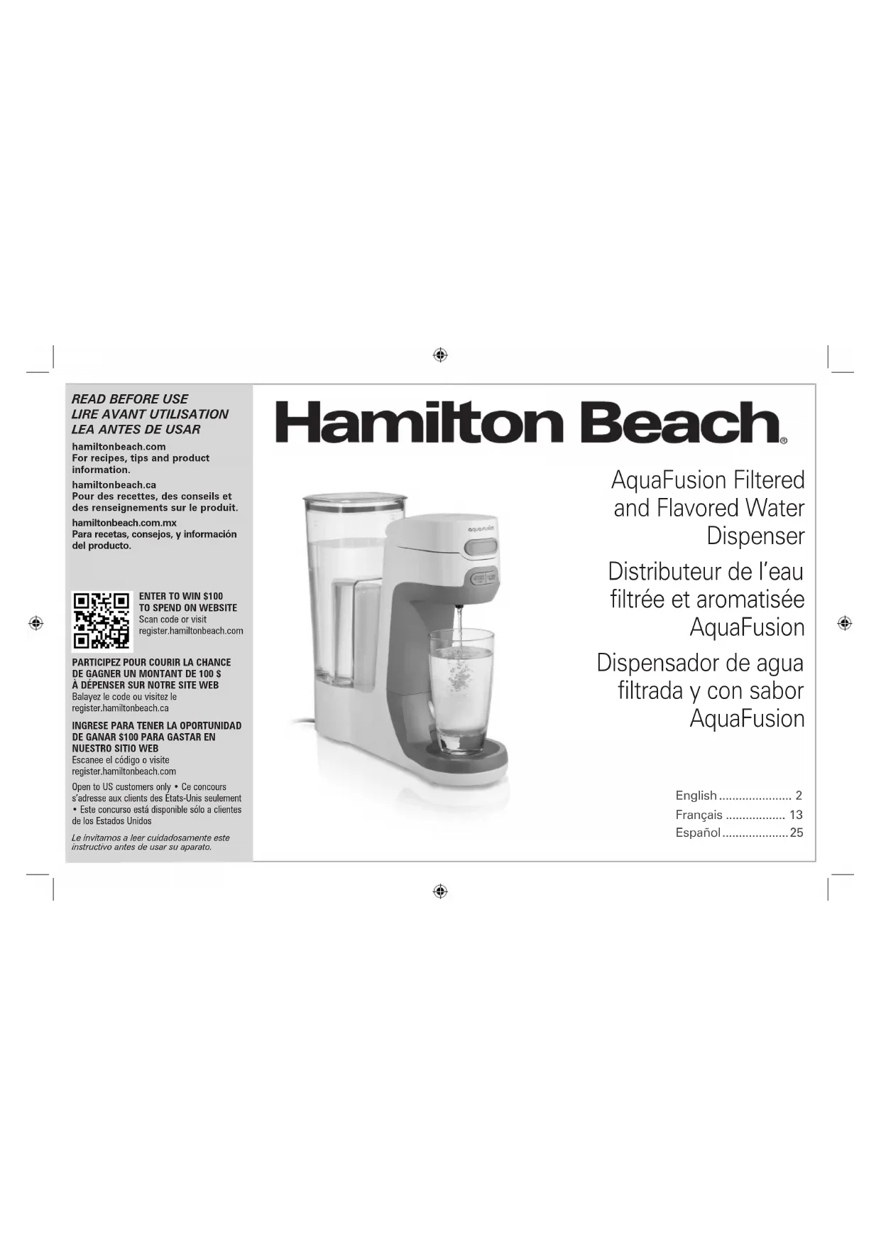 3. Mettre un nouveau filtre dans la cuvette pour filtre à eau et aligner la flèche du filtre à eau avec la flèche à l’extérieur de la cuvette pour filtre à eau. Tourner dans le sens horaire pour verrouiller. 4. Retirer le couvercle du réservoir d’eau. Ajouter seulement de l’eau froide jusqu’à la ligne de remplissage MAX. Mettre le couvercle sur le réservoir d’eau en appuyant dessus. 5. Maintenir le réservoir d’eau en orientant l’ouverture pour le filtre à eau vers le devant, abaisser le réservoir d’eau pour le fixer en place. Remettre le couvercle et appuyer pour bien le refermer. 6. Appuyer et maintenir le bouton Flavor + Filtered (aromatisée et filtrée) et le bouton pour eau filtrée pendant au moins 3 secondes. Le voyant se mettra à clignoter lorsque la réinitialisation sera terminée et s’éteindra par la suite. 7. Après l’installation du filtre à eau, mettre un grand contenant sur la plateforme pour tasse. Appuyer et maintenir le bouton pour eau filtrée à nouveau pour vider toute l’eau du réservoir d’eau et rincer le nouveau filtre. Jeter l’eau filtrée et répéter le processus en remplissant le réservoir d’eau une deuxième fois.24 Garantie limitée Cette garantie s’applique aux produits achetés et utilisées aux É.-U. et au Canada. C’est la seule garantie expresse pour ce produit et est en lieu et place de tout autre garantie ou condition. Ce produit est garanti contre tout défaut de matériaux et de main-d’oeuvre pour une période de cinq (5) ans à compter de la date d’achat d’origine au Canada et un (1) an à compter de la date d’achat d’origine aux É.-U. Au cours de cette période, votre seul recours est la réparation ou le remplacement de ce produit ou tout composant s’avérant défectueux, à notre gré, mais vous êtes responsable de tous les coûts liés à l’expédition du produit et le retour d’un produit ou d’un composant dans le cadre de cette garantie. Si le produit ou un composant n’est plus offert, nous le remplacerons par un produit similaire de valeur égale ou supérieure. Cette garantie ne couvre pas le verre, les filtres, l’usure d’un usage normal, l’utilisation non conforme aux directives imprimées, ou des dommages au produit résultant d’un accident, modification, utilisation abusive ou incorrecte. Cette garantie s’applique seulement à l’acheteur original ou à la personne l’ayant reçu en cadeau. La présentation du reçu de vente d’origine comme preuve d’achat est nécessaire pour faire une réclamation au titre de cette garantie. Cette garantie s’annule si le produit est utilisé autrement que par une famille ou si l’appareil est soumis à toute tension ou forme d’onde différente des caractéristiques nominales précisées sur l’étiquette (par ex. : 120 V ~ 60 Hz). Nous excluons toutes les réclamations au titre de cette garantie pour les dommages spéciaux, consécutifs et indirects causés par la violation de garantie expresse ou implicite. Toute responsabilité est limitée au prix d’achat. Chaque garantie implicite, y compris toute garantie ou condition de qualité marchande ou d’adéquation à un usage particulier, est exonérée, sauf dans la mesure interdite par la loi, auquel cas la garantie ou condition est limitée à la durée de cette garantie écrite. Cette garantie vous donne des droits légaux précis. Vous pouvez avoir d’autres droits qui varient selon l’endroit où vous habitez. Certaines provinces ne permettent pas les limitations sur les garanties implicites ou les dommages spéciaux ou indirects de telle sorte que les limitations ci-dessus ne s’appliquent peut-être pas à votre cas. Pour faire une réclamation au titre de la garantie, veuillez ne pas retourner cet appareil au magasin. Veuillez nous écrire à Hamilton Beach Brands, Inc., Customer Service Department, 4421 Waterfront Dr., Glen Allen, VA 23060, ou visiter le site hamiltonbeach.com/ customer-service aux États-Unis ou hamiltonbeach.ca/customer-service au Canada. Pour obtenir un service plus rapide, veuillez repérer les numéros de modèle, de type et de séries sur votre appareil.25 SALVAGUARDIAS IMPORTANTES Este no es un juguete ni un producto para niños. Este producto no está diseñado ni destinado a ser utilizado por niños menores de 12 años. Es necesaria la supervisión de un adulto cuando cualquier aparato sea usado por niños o cerca de ellos. Cuando utilice aparatos eléctricos, siempre deben seguirse precauciones de seguridad básicas a fin de reducir el riesgo de incendio, descarga eléctrica, y/o lesiones a personas, incluyendo las siguientes: