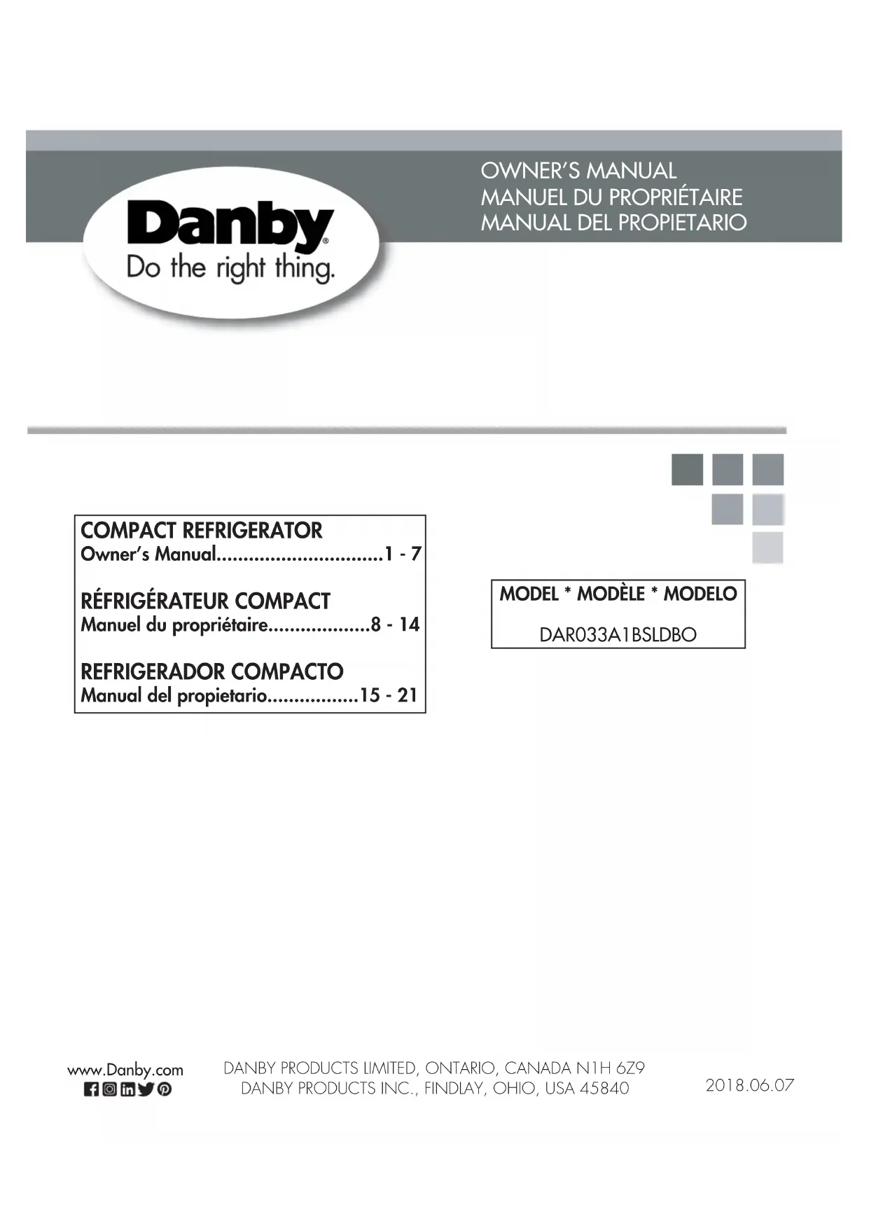 Cet appareil de qualité est garanti exempt de tout vice de matière première et de fabrication, s’il est utilisé dans les conditions normales recommandées par le fabricant. Cette garantie n’est offerte qu’à l’acheteur initial de l’appareil vendu par Danby Products Limited (Canada) ou Danby Products Inc. (É.-U.) (ci-après « Danby ») ou par l’un de ses distributeurs agréés et elle ne peut être transférée.CONDITIONS Les pièces en plastique sont garanties pendant trente (30) jours seulement à partir de la date de l’achat, sans aucune prolongation prévue. Aucune partie de la garantie ne prévoit implicitement que le fabricant sera tenu responsable des dommages subis par les aliments ou d’autres types de contenu, qu’ils soient causés par la défectuosité de l’appareil ou par son usage adéquat ou inadéquat.EXCLUSIONS En vertu de la présente, il n’existe aucune autre garantie, condition ou représentation, qu’elle soit exprimée ou tacite, de façon manifeste ou intentionnelle, par Danby ou ses distributeurs agréés. De même, sont exclues toutes les autres garanties, conditions ou représentations, y compris les garanties, conditions ou représentations en vertu de toute loi régissant la vente de produits ou de toute autre législation ou règlement semblable. En vertu de la présente, Danby ne peut être tenue responsable en cas de blessures corporelles ou de dégâts matériels, y compris à l’appareil, quelle qu’en soit les causes. Danby ne peut pas être tenue responsable des dommages indirects dus au fonctionnement défectueux de l’appareil. En achetant l’appareil, l’acheteur accepte de tenir sans reproche et de dégager Danby de toute responsabilité en cas de réclamation pour toute blessure corporelle ou tout dégât matériel causé par cet appareil.CONDITIONS GÉNÉRALESLa garantie ou assurance ci-dessus ne s’applique pas si les dégâts ou réparations sont dus aux cas suivants : 1) Panne de courant.2) Dommages subis pendant le transport ou le déplacement de l’appareil.3) Alimentation électrique incorrecte (tension faible, câblage défectueux, fusibles incorrects). 4) Accident, modification, emploi abusif ou incorrect de l’appareil tel qu'une circulation d'air inadéquate dans la pièce ou des conditions de fonctionnement anormales (température extrêmement élevée ou basse). 5) Utilisation dans un but commercial ou industriel (à savoir, si l'appareil n'est pas installé dans un domicile résidentiel). 6) Incendie, dommages causés par l’eau, le vol, la guerre, une émeute, des hostilités, ou en cas de force majeure (ouragan, inondation, etc.).7) Visites d’un technicien pour expliquer le fonctionnement de l’appareil au propriétaire. 8) Installation inappropriée (par exemple, encastrement d'un appareil autoportant, ou utilisation extérieure d'un appareil non conçu à cet effet, y compris, mais sans s'y limiter : les garages, les patios, les porches ou ailleurs, qui ne sont pas correctement isolés ou climatisés). La preuve de la date d'achat sera requise pour les réclamations de garantie; conserver la facture de vente. Dans le cas où un service de garantie est requis, présentez la preuve d'achat à notre dépôt de service agréé. Service sous garantie Service au domicile Danby Products Limited PO Box 1778, Guelph, Ontario, Canada N1H 6Z9 Téléphone : (519) 837-0920 Télécopieur : (519) 837-0449 Danby Products Inc. PO Box 669, Findlay, Ohio, U.S.A. 45840 Téléphone : (419) 425-8627 Télécopieur : (419) 425-8629 1-800-263-2629 02/18 Premiers 12 mois15 1-800-26- Danby(1-800-263-2629) Bienvenido Bienvenido a la familia Danby. Estamos orgullosos de nuestros productos de calidad y creemos en un servicio confi able. Sugerimos que lea este manual del propietario antes de conectar el nuevo aparato ya que contiene información importante sobre la operación, información de seguridad, solución de problemas y consejos de mantenimiento para garantizar la fi abilidad y longevidad de su electrodoméstico. Visite www.Danby.com para acceder a herramientas de autoservicio, preguntas frecuentes y mucho más. Para asistencia adicional, llame al 1-800-263-2629. Tenga en cuenta la información siguiente; Necesitará esta información para obtener un servicio bajo garantía. Debe proporcionar el recibo de compra original para validar su garantía y recibir servicio. Número de modelo: _____________________________________________ Número de serie: _______________________________________________ Fecha de compra: _______________________________________________ Necesitas ayuda? Antes de llamar al servicio, aquí hay algunas cosas que puede hacer para ayudarnos a servirle mejor. Lea este manual del propietario: Contiene instrucciones para ayudarle a usar y mantener su aparato correctamente. Si recibe un aparato dañado: Inmediatamente póngase en contacto con el minorista o el constructor que le vendió el aparato. Ahorre tiempo y dinero: Consulte la sección de solución de problemas al fi nal de este manual antes de llamar. Esta sección le ayudará a resolver problemas comunes que pueden ocurrir.16