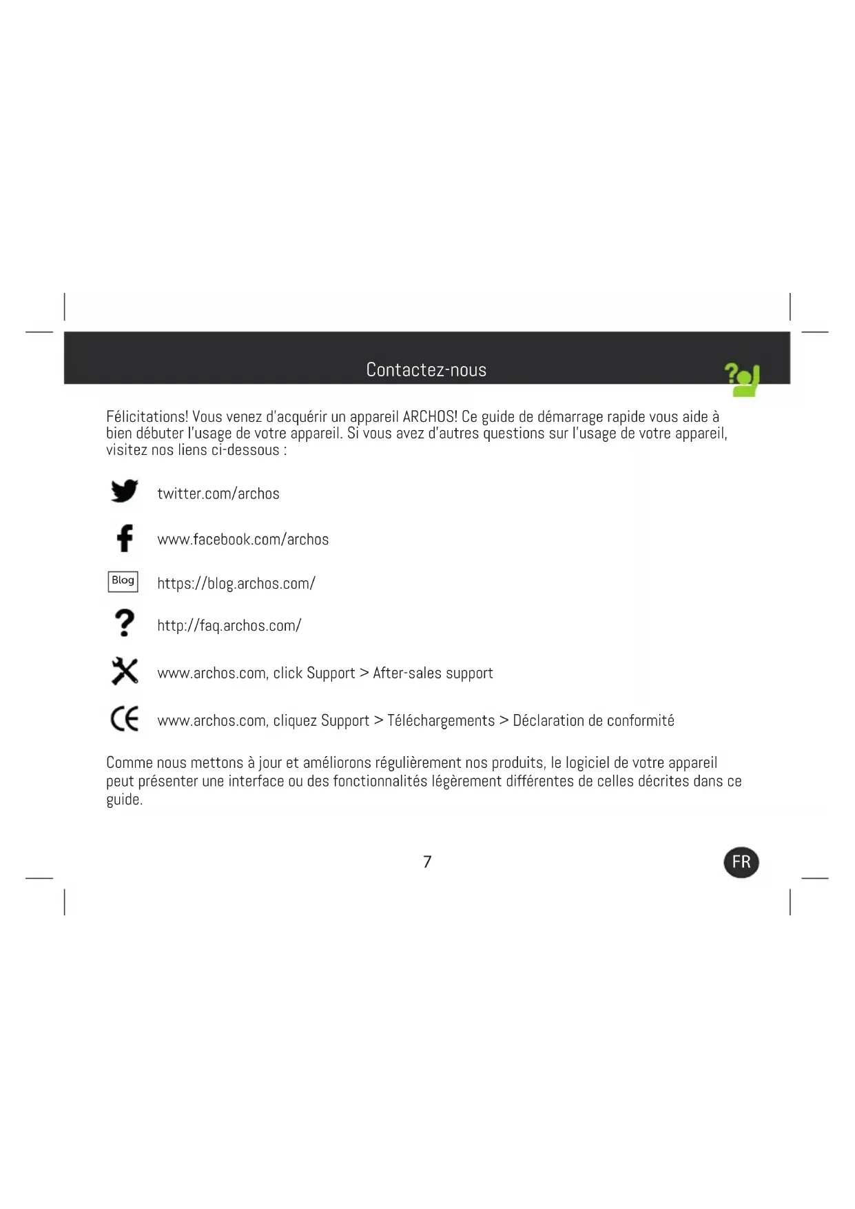 Félicitations! Vous venez d’acquérir un appareil ARCHOS! Ce guide de démarrage rapide vous aide à bien débuter l’usage de votre appareil. Si vous avez d’autres questions sur l’usage de votre appareil, visitez nos liens ci-dessous : twitter.com/archos www.facebook.com/archos Blog https://blog.archos.com/ http://faq.archos.com/ www.archos.com, click Support > After-sales support www.archos.com, cliquez Support > Téléchargements > Déclaration de conformité Comme nous mettons à jour et améliorons régulièrement nos produits, le logiciel de votre appareil peut présenter une interface ou des fonctionnalités légèrement différentes de celles décrites dans ce guide. Contactez-nous8 Warranty INPUT: 5V 2AModel: AC101CR3GMADE IN PRCCore 1013G Déballage ARCHOS Core 101 4G Guide d’utilisation rapide Adaptateur Câble de charge Livret des garanties et des mentions légales et sécuritaires9 INPUT: 5V 2AModel: AC101CR3GMADE IN PRC Core 101