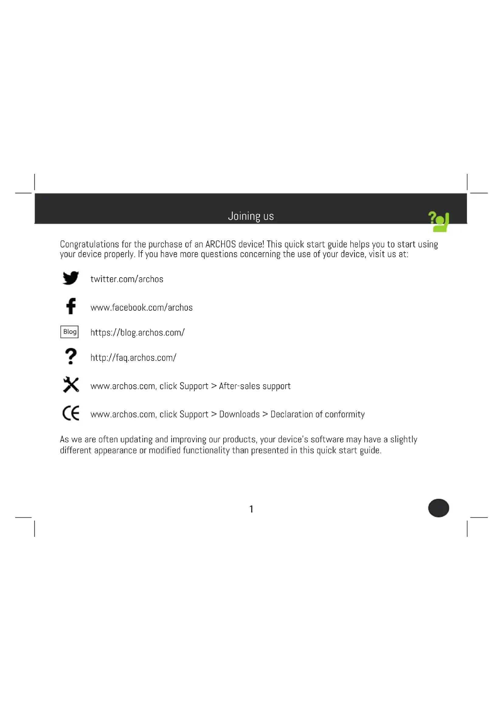 Félicitations! Vous venez d’acquérir un appareil ARCHOS! Ce guide de démarrage rapide vous aide à bien débuter l’usage de votre appareil. Si vous avez d’autres questions sur l’usage de votre appareil, visitez nos liens ci-dessous : twitter.com/archos www.facebook.com/archos Blog https://blog.archos.com/ http://faq.archos.com/ www.archos.com, click Support > After-sales support www.archos.com, cliquez Support > Téléchargements > Déclaration de conformité Comme nous mettons à jour et améliorons régulièrement nos produits, le logiciel de votre appareil peut présenter une interface ou des fonctionnalités légèrement différentes de celles décrites dans ce guide. Contactez-nous8 Warranty INPUT: 5V 1.5AModel: AC101AS3GV2MADE IN PRCARCHOS SA. 12 rue Ampère 91430 Igny France Access 101