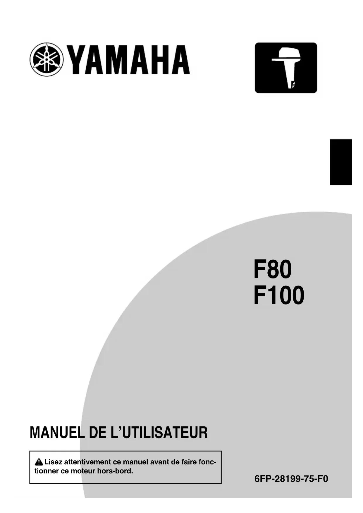 F80 F100 6FP-28199-75-F0 Lisez attentivement ce manuel avant de faire fonc- tionner ce moteur hors-bord. MANUEL DE L’UTILISATEURLisez attentivement ce manuel avant de faire fonctionner ce moteur hors- bord. Conservez ce manuel à bord dans un sac étanche lorsque vous navi- guez. Ce manuel doit accompagner le moteur hors-bord s’il est vendu.FMU25108 Avis au propriétaire Nous vous remercions d’avoir sélectionné un moteur hors-bord Yamaha. Le présent ma- nuel de l’utilisateur comporte les informations requises pour une utilisation, un entretien et des manipulations corrects. La bonne com- préhension de ces instructions assez sim- ples contribuera à vous procurer un maxi- mum de satisfactions de votre nouveau Yamaha. Si vous avez des questions relati- ves au fonctionnement ou à l’entretien de vo- tre moteur hors-bord, consultez un distribu- teur Yamaha. Les informations importantes contenues dans le présent manuel de l’utilisateur sont mises en évidence de la façon suivante. : C’est le symbole d’alerte de sécurité. Il sert à vous alerter en cas de risques de bles- sures potentiels. Conformez-vous à tous les messages de sécurité qui suivent ce symbole afin d’éviter toute blessure, voire la mort. FWM00782 Un AVERTISSEMENT indique une situ- ation dangereuse qui, si elle ne peut être évitée, pourrait entraîner des blessures graves, voire la mort. FCM00702 Un ATTENTION indique les consignes spéciales qui doivent être respectées afin d’éviter d’endommager le moteur hors- bord ou d’autres biens. REMARQUE: Une REMARQUE fournit des informations importantes qui facilitent et expliquent les dif- férentes procédures. Yamaha travaille continuellement à l’amélio- ration de la conception et de la qualité de ses produits. Par conséquent, bien que le pré- sent manuel contienne les dernières infor- mations produit disponibles au moment de la mise sous presse, il peut y avoir de légères différences entre votre moteur hors-bord et le présent manuel. Si vous avez des questions au sujet du présent manuel, consultez votre revendeur Yamaha. Pour garantir la longévité de ce produit, Yamaha recommande que vous utilisiez le produit et que vous appliquiez les inspections et l’entretien périodiques spécifiques en sui- vant correctement les instructions du manuel de l’utilisateur. Tout dommage résultant de la négligence de ces instructions n’est pas cou- vert par la garantie. Certains pays appliquent des lois ou des ré- glementations interdisant aux utilisateurs de faire sortir le produit du pays où il a été ache- té, et il peut s’avérer impossible d’enregistrer le produit dans le pays de destination. De plus, la garantie peut ne pas s’appliquer dans certaines régions. Si vous planifiez d’emme- ner le produit dans un autre pays, consultez le revendeur chez qui le produit a été acheté pour des informations complémentaires. Si le produit a été acheté d’occasion, veuillez consulter votre revendeur le plus proche pour votre réenregistrement de client et pour être habilité à faire appel aux services spécifiés. REMARQUE: Le F80B, F100B et les accessoires standard servent de base aux explications et aux illus- trations contenues dans le présent manuel. De ce fait, certaines caractéristiques peuvent ne pas s’appliquer à tous les modèles. Informations importantes sur le manuelFMU25123 F80, F100