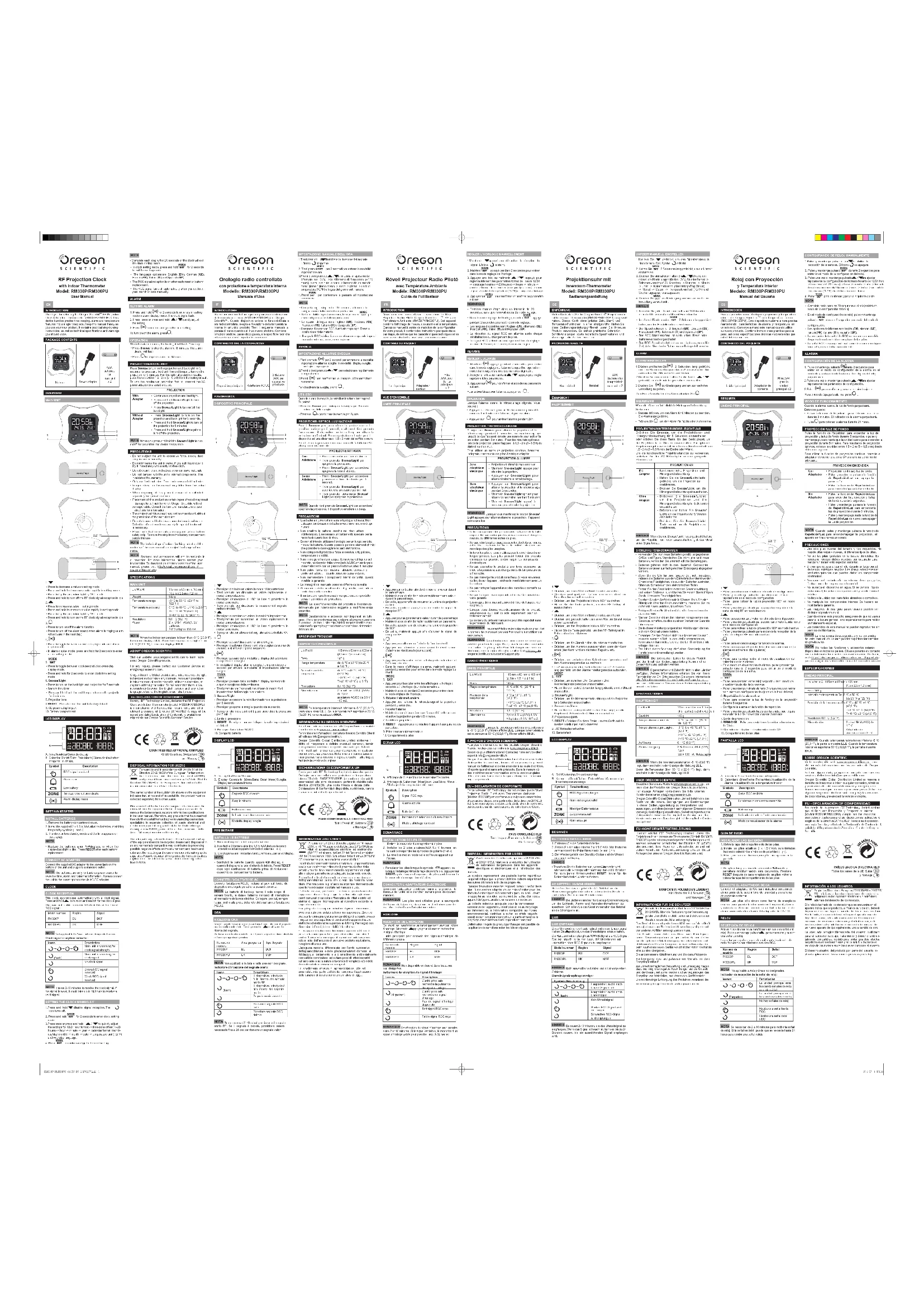Aux termes des Directives européennes 2011/65/EU et 2012/19/EU, relatives à la réduction de l’utilisation de substances dangereuses dans les appareils électriques et électroniques et à l’élimination des déchets.Le symbole représentant une poubelle barrée reporté sur l’appareil indique que le produit doit être collecté séparément des autres déchets à la fin de sa propre vie.L’usager devra done remettre l’appareil, lorsqu’il ne l’utilisera plus, à des centres adaptés de collecte sélective pour les déchets électroniques et électrotechniques, ou bien il devra le rapporter au revendeur au moment de l’achat d’un nouvel appareil de type équivalent, en raison d’un contre un.La collecte sélective adéquate pour la transmission successive de l’appareil qui n’est plus utilisé au recyclage, au traitement ou à l’élimination compatible au niveau environnemental, contribue à éviter les effets négatifs possibles sur l’environnement et sur la santé et favorise le recyclage des matériaux dont l’appareil est composé.L’élimination illégale du produit par l’usager est passible de l’application de sanctions selon les lois en vigueur. Projektionsuhr mit Innenraum-Thermometer Modell: RM330P/RM330PU Bedienungsanleitung