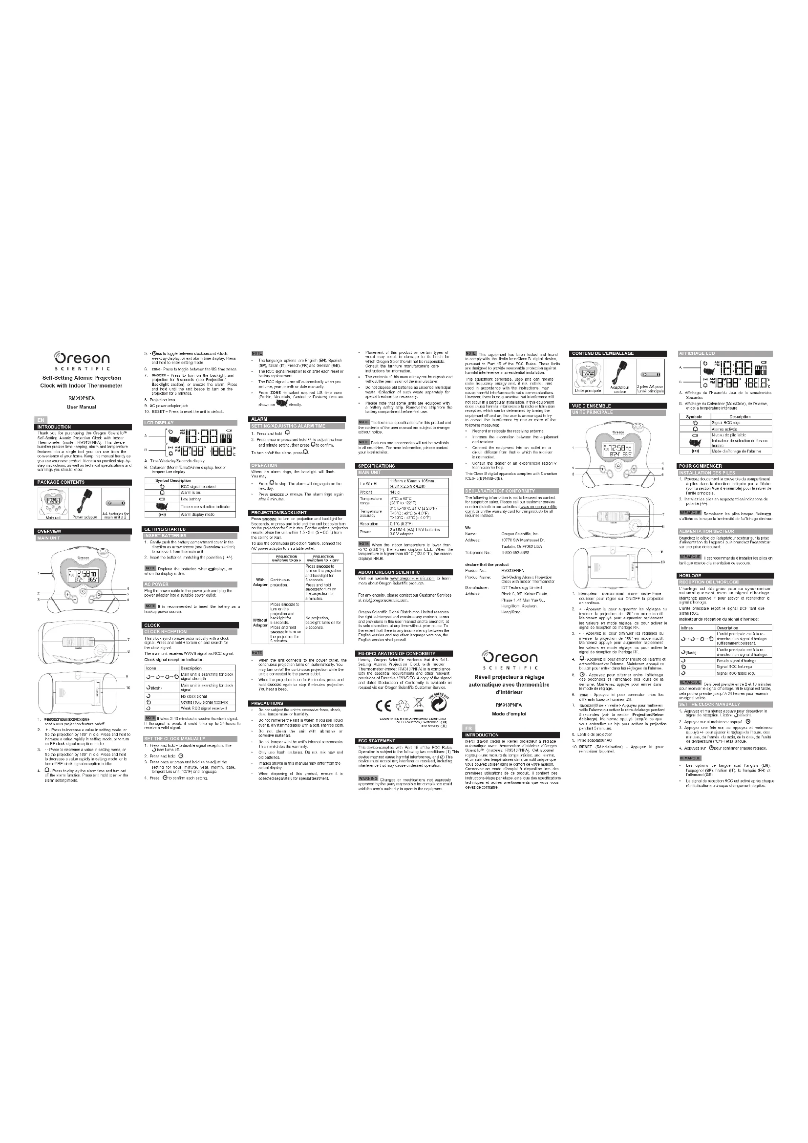 - Les opti ons de langue sont l’anglais (EN), l’espagnol (SP), l’italien (IT), le français (FR) et l’allemand (GE).• Le signal de réception RCC est activé après chaque réinitialisation ou chaque changement de piles. Réveil projecteur à réglage automatique avec thermomètre d’intérieur RM313PNFA Mode d’emploi INTRODUCTION Merci d’avoir choisi le Réveil projecteur à réglage automatique avec thermomètre d’intérieur d’Oregon Scientific™ (modèles: RM313PNFA). Cet appareil regroupe une mesure du temps précise, une alarme, et un suivi des températures dans un outil unique que vous pouvez utiliser dans le confort de votre maison. Conservez ce mode d’emploi à disposition lors des premières utilisations de ce produit. Il contient des instructions étape par étape, ainsi que des spécifications techniques et autres avertissements que vous vous devez de connaitre. RM313PNFA_UM_MP_R9.indd 1 2015/8/27 11:04:05 AMES