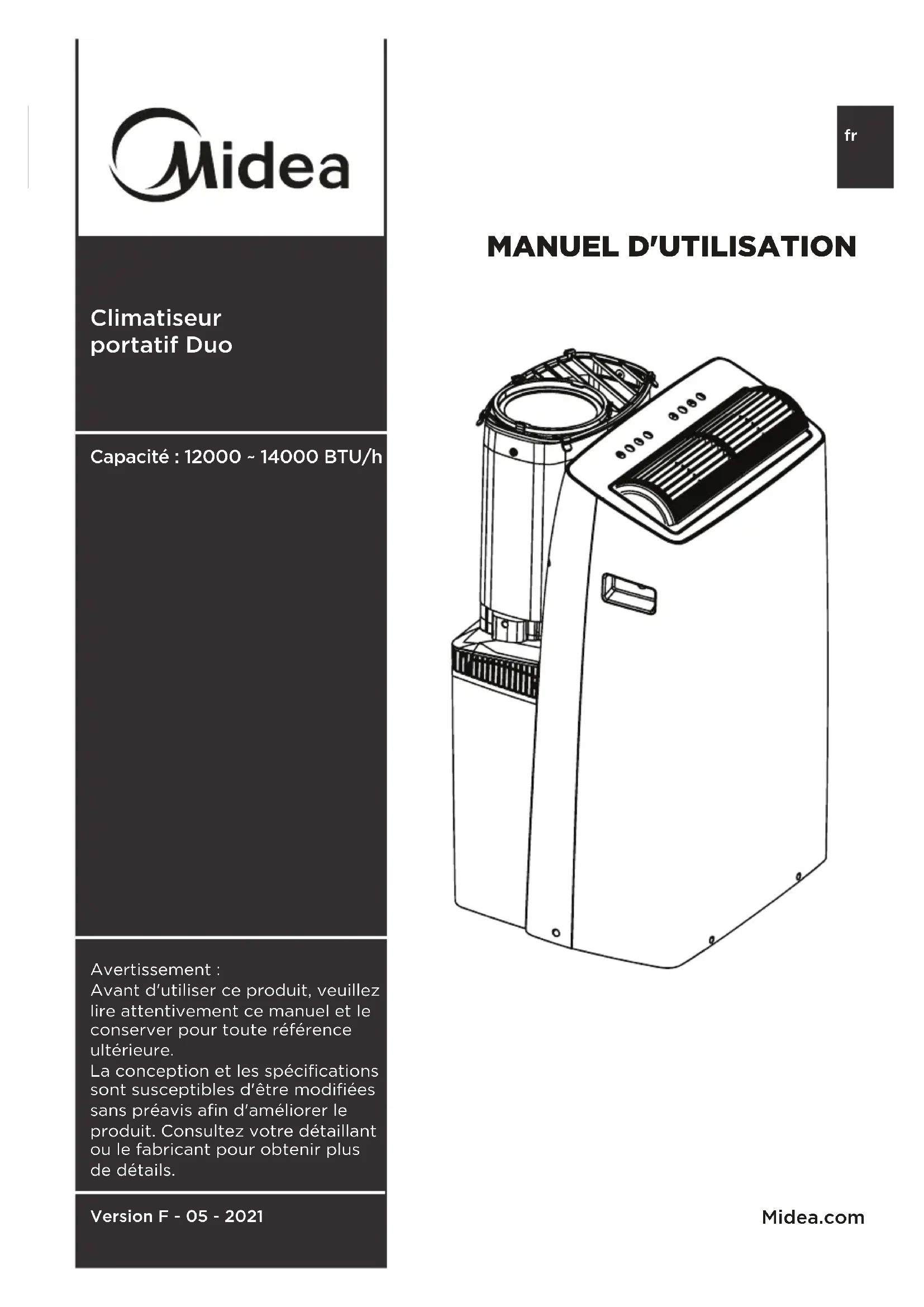 Avant d'utiliser ce produit, veuillez lire attentivement ce manuel et le conserver pour toute référence ultérieure. La conception et les spécifications sont susceptibles d'être modifiées sans préavis afin d'améliorer le produit. Consultez votre détaillant ou le fabricant pour obtenir plus de détails. Capacité : 12000 ~ 14000 BTU/h Version F - 05 - 2021 Page 2 Veuillez lire ce manuel Vous trouverez à l'intérieur de ce manuel de nombreux conseils utiles sur la façon d'utiliser et d'entretenir correctement votre climatiseur. Un petit entretien préventif de votre part peut vous faire gagner beaucoup de temps et d'argent sur la durée d'utilisation de votre climatiseur. Vous trouverez de nombreuses réponses aux problèmes les plus courants dans les astuces de dépannage. Vous devriez être en mesure de résoudre la plupart d'entre eux rapidement avant d'appeler le service après-vente. Ces instructions peuvent ne pas couvrir toutes les conditions d'utilisation possibles. Aussi, il convient de faire preuve de bon sens et d'être attentif à la sécurité lors de l'installation, de l'utilisation et de l'entretien de ce produit.