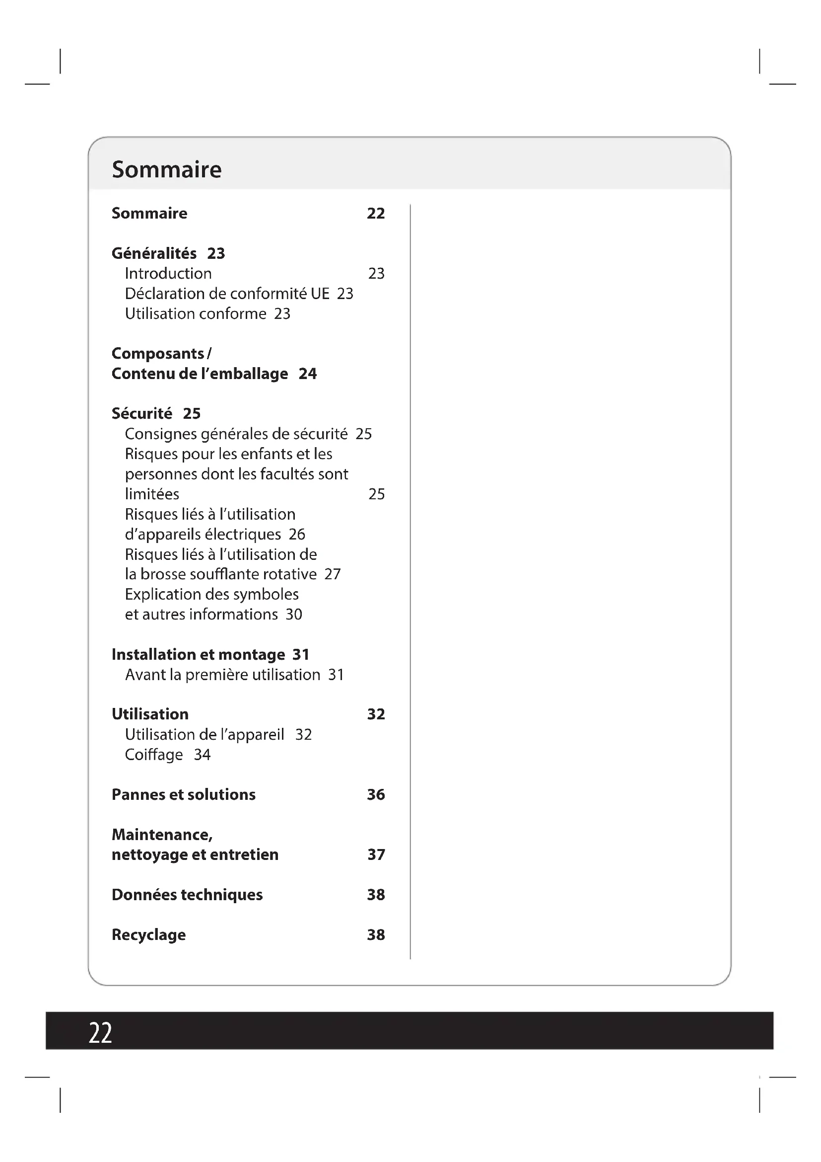 électrique et prise secteur J) Mode d'emploi et carte de garantie (non illustrées)25 Sécurité Veuillez lire et respecter les consignes de sécu- rité énoncées ci-après. Le non-respect de ces consignes peut engen- drer des risques d’ac- cident et de blessures, ainsi que des dom- mages matériels ou des dysfonctionnements de l’appareil. Consignes générales de sécurité Risques pour les enfants et les personnes dont les facultés sont limitées - Les enfants âgés de plus de 8 ans et les personnes dont les facultés phy- siques, sensorielles ou mentales sont limitées ou les personnes manquant d’expérience et/ou de connaissances sont auto- risés à utiliser cet appareil, à condition qu’ils soient surveillés ou qu’ils aient été instruits quant à son usage sûr et qu’ils aient compris les dangers en résultant. - Le nettoyage et l’entretien de l’appareil ne doivent pas être eectués par des enfants de moins de 8 ans. Passé cet âge, les enfants peuvent réaliser ces opérations s’ils sont surveillés. Les enfants de moins de 8 ans doivent être tenus à distance de l’appareil et du cordon. - Les enfants ne doivent pas jouer avec l’appareil. Les enfants ne sont pas conscients du danger inhérent à l’utilisation d’appareils électriques. Par conséquent, utilisez et conservez l’appareil hors de portée des enfants de moins de 8ans. Ne lais- sez pas pendre le cordon électrique an d’éviter que quelqu’un ne tire des- sus.26 - Conservez l’emballage hors de portée des en- fants – Risque d’asphyxie! Risques liés à l’utilisation d’appareils électriques - Branchez l’appareil uni- quement sur une prise secteur avec terre, instal- lée de manière conforme et dont la tension de secteur respecte la plaque signalétique. - Si le câble d’alimenta- tion est endommagé, il doit être remplacé par le fabricant, son SAV ou des personnes de qualica- tion similaire an d’éviter un danger. - Veillez à ce que la prise secteur se trouve à proxi- mité de l’appareil et soit facilement accessible de façon à ce que l’appareil puisse être rapidement débranché en cas d’acci- dent. - Seuls des ateliers spé- cialisés et habilités sont autorisés à eectuer les réparations. Les appareils réparés par un personnel non spécialisé repré- sentent un danger pour l’utilisateur. - An d’éviter tout accident, ne laissez pas l’appareil sans surveillance pendant qu’il fonctionne. - An d’éviter tout accident, n’utilisez jamais la même prise secteur avec terre pour brancher simultané- ment plusieurs appareils ménagers (par exemple sur une triplite). - Ne plongez jamais l’appa- reil dans l’eau et ne l’utili- sez pas en plein air, car ce dernier ne doit en aucun cas être exposé à la pluie ou à l’humidité – Risque d’électrocution! - Si l’appareil venait à tomber dans l’eau, dé- branchez d’abord la prise avant de le sortir de l’eau! Ne remettez pas l’appareil en service avant de l’avoir fait contrôler par un SAV27 agréé. Ceci vaut égale- ment lorsque le câble d’alimentation ou l’appa- reil est endommagé ou si l’appareil est tombé. Risque d’électrocution! - Débranchez toujours la prise lorsque l’appareil n’est pas utilisé, avant le nettoyage et lors de dysfonctionnements. Ne tirez jamais sur le cordon électrique! Risque d’électrocution! - Assurez-vous de ne jamais placer le cordon élec- trique ou l’appareil sur des surfaces chaudes ou à proximité de sources de chaleur. Placez le cordon électrique de telle manière qu’il n’entre pas en contact avec des objets chauds ou tranchants. Risque d’électrocution! - Ne pliez jamais le cordon électrique et ne l’enroulez pas autour de l’appareil sous peine de rupture du cordon. Risque d’électrocution! - N’utilisez jamais l’appareil lorsque vous vous trouvez sur un sol humide ou que vos mains ou l’appareil sont mouillés. Risque d’électrocution! - N’ouvrez jamais l’appareil et n’essayez en aucun cas d’introduire à l’intérieur des objets métalliques. Risque d’électrocution! Risques liés à l’utilisation de la brosse souante rotative - Ne couvrez pas la grille d’en- trée d’air pendant l’utilisation de l’appareil et nettoyez-la de temps en temps avec une brosse. Veillez à ce qu’aucun résidu (cheveux ou autres) ne pénètre dans l’appareil. Si la grille d’entrée d’air est obstruée, la protection an- ti-surchaue se déclenche et l’appareil s’éteint. Dans ce cas, débranchez la prise et laissez l’appareil refroidir. La brosse souante est alors de nou- veau prête à l’emploi.2828 - Éteignez l’appareil et débran- chez-le avant de le poser. - N’utilisez pas la brosse souf- ante pour les perruques ou les postiches en matière synthétique. - Pendant l’utilisation, tenez la brosse souante unique- ment au niveau de la poi- gnée. - Ne touchez pas les acces- soires (brosses rondes) pendant le fonctionnement de l’appareil! (Risque de brû- lure) - Pour utiliser l’appareil de manière optimale, procédez au coiage sur cheveux légè- rement humides, jamais sur cheveux mouillés. - Utilisez la brosse souante uniquement pour le coiage de cheveux humains, en au- cun cas à d’autres ns. - Si la brosse souante est uti- lisée dans une salle de bain, pensez à débrancher la prise après utilisation. La proximité de l’eau constitue en eet un danger, même lorsque l’ap- pareil est éteint. En guise de protection supplémentaire, il est recommandé de monter un disjoncteur diérentiel (FI/DDR) avec un courant ré- siduel n’excédant pas 30mA au niveau de l’installation électrique de la salle de bain. Demandez conseil à votre électricien. - N’utilisez jamais l’appareil dans ou à proximité d’une baignoire, d’une douche, d’un lavabo ou d’autres récipients contenant de l’eau ou d’autres liquides. Le risque d’électrocution subsiste éga