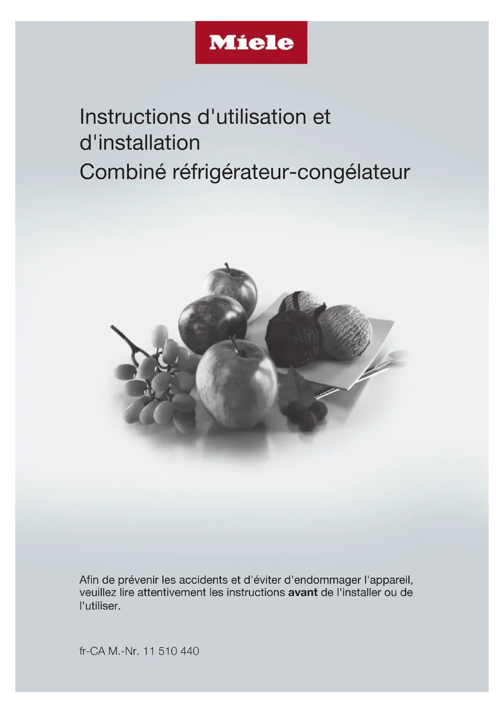Instructions d'utilisation et d'installation Combiné réfrigérateur-congélateur Afin de prévenir les accidents et d'éviter d'endommager l'appareil, veuillez lire attentivement les instructions avant de l'installer ou de l'utiliser. fr-CA M.-Nr. 11 510 440Table des matières
