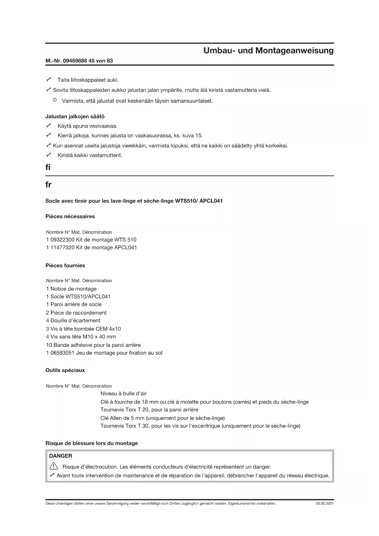 A En cas de fixation au sol, fixer au sol au moins deux pieds de socle, dont au moins un à l'arrière. Pour un résultat optimal, procéder à une fixation au sol diagonale. Risques provoqués par des matériaux inappropriés dans le tiroir du socle DANGER A Ne pas conserver de matières inflammables dans le tiroir. REMARQUE Les éléments en bois peuvent gonfler et/ ou travaillent. A Ne pas conserver d'objets humides ou mouillés dans le tiroir. Installer le socle Sortir le tiroir du socle A Tirer le tiroir jusqu'à la butée, voir fig. 2. A Appuyer sur les serrures à ressort et retirer en même temps le tiroir en tirant vers le haut, voir fig. 3. Monter le socle en dessous du sèche-linge A Vider le réservoir d'eau condensée.Umbau- und Montageanweisung M.-Nr. 09469886 47 von 83 Diese Unterlagen dürfen ohne unsere Genehmigung weder vervielfältigt noch Dritten zugänglich gemacht werden. Eigentumsrechte vorbehalten. 26.02.2021 A Visser à fond les pieds du sèche-linge à l'aide d'une clé à molette. A Dévisser les tiges filetées du socle avec une clé Allen de 5mm (A) et éliminer, voir fig. 4. A Visser les vis sans têtes 10x40mm jointes dans les boulons jusqu'à la butée (B), voir fig. 4. AVERTISSEMENT Risque d'écrasement: veiller à ne pas mettre les doigts entre la carrosserie du sèche-linge et les tiges filetées. A Ne pas soulever le sèche-linge par les coins. A Poser le sèche-linge sur le socle et insérer les tiges filetées dans les ouvertures des pieds du sèche-linge, voir fig. 5. A Monter le joint d'étanchéité sur le côté intérieur de la paroi arrière, comme indiqué sur l'illustration, voir fig. 6. A Sur la paroi arrière du sèche-linge, desserrer les vis sur les excentriques (1), voir fig. 7 Les excentriques peuvent se décaler légèrement lorsque les vis sont desserrées. Pour un montage sécurisé de l'appareil, les excentriques doivent être de nouveau placées dans leur position initiale: dent d'engrenage en bas à gauche à un angle de 20° (1), voir fig. 7. A Avec 1vis à tête bombée CEM 4x10, fixer la paroi arrière en bas sur le socle (2), voir fig. 7. A Accrocher les éléments de raccord (3) sur les vis sur les excentriques, voir fig. 7. A Fixer la paroi arrière sur le socle à l'aide de 2vis à tête bombée CEM 4x10, et la paroi arrière en haut sur le socle (1), voir fig. 8. A Serrer les vis sur les excentriques (2), voir fig. 8. A Ajuster l'appareil et le socle avec un niveau. A Bloquer les pieds du socle. A Fixer le socle au sol avec le jeu de montage de fixation au sol réf. 06593051. Monter le socle sous les lave-linge Il faut fixer les éléments de raccord sur le socle avant de procéder au montage proprement dit. Ils servent à raccorder deux socles ensemble. Fixer les éléments de raccord, même s'il n'y a pas encore de second socle. Cela facilite grandement la tâche en cas d'installation ultérieure et permet de garder les éléments de raccord en lieu sûr. Disposition avec le sèche-linge à gauche et le lave-linge à droite: voir fig. 9. Disposition avec le lave-linge à gauche et le sèche-linge à droite: voir fig. 10. A Maintenir les boulons filetés sur le socle à l'aide d'une clé à molette et desserrer tous les pieds du socle. A Dévisser 2 pieds à gauche ou à droite selon la disposition, voir fig.9 ou fig.10. A Monter la rondelle sur le bac de fond, voir fig. 9 ou fig. 10. A Monter l'élément de raccord(1) sur la rondelle, voir fig.9 ou fig.10. A Revisser les 2pieds du socle, mais ne pas encore fixer avec le contre-écrou. REMARQUE Risques de dommages sur le lave-linge et le revêtement du sol. A Evacuer l'eau du lave-linge. A Retirer l'unité de dosage. A Poser le lave-linge sur le côté uniquement avec les sécurités de transport installées. A Poser le lave-linge sur un support plat et lisse (par ex. un tapis). A Monter les sécurités de transport si elles ont été enlevées. Voir mode d'emploi de l'appareil. A Poser le lave-linge sur le côté. A Desserrer et retirer les pieds du lave-linge. A Insérer les douilles d'écartement(1) dans les tiges filetées, voir fig.11. A Assembler le socle et le lave-linge.Umbau- und Montageanweisung M.-Nr. 09469886 48 von 83 Diese Unterlagen dürfen ohne unsere Genehmigung weder vervielfältigt noch Dritten zugänglich gemacht werden. Eigentumsrechte vorbehalten. 26.02.2021 A Serrer les boulons avec une clé à fourche depuis le côté intérieur du socle. Serrer uniformément les boulons, c'est-à- dire petit à petit, en passant régulièrement d'un boulon à l'autre. A Redresser les parties combinées. A Monter le joint d'étanchéité sur le côté intérieur de la paroi arrière, comme indiqué sur l'illustration, voir fig. 6. A Fixer la paroi arrière sur le socle à l'aide de 3vis à tête bombée CEM 4x10, voir fig. 12. A Ajuster l'appareil et le socle avec un niveau. A Replier les éléments de raccord au niveau du socle. A Bloquer les pieds du socle. A Fixer le socle au sol avec le jeu de montage de fixation au sol réf. 06593051. REMARQUE A Retirer les sécurités de transport. Monter le tiroir A Poser le tiroir sur les glissières et fermer.