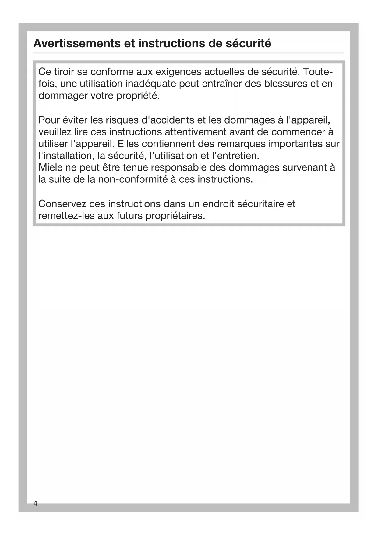 Ce tiroir se conforme aux exigences actuelles de sécurité. Toute- fois, une utilisation inadéquate peut entraîner des blessures et en- dommager votre propriété. Pour éviter les risques d'accidents et les dommages à l'appareil, veuillez lire ces instructions attentivement avant de commencer à utiliser l'appareil. Elles contiennent des remarques importantes sur l'installation, la sécurité, l'utilisation et l'entretien. Miele ne peut être tenue responsable des dommages survenant à la suite de la non-conformité à ces instructions. Conservez ces instructions dans un endroit sécuritaire et remettez-les aux futurs propriétaires.Avertissements et instructions de sécurité