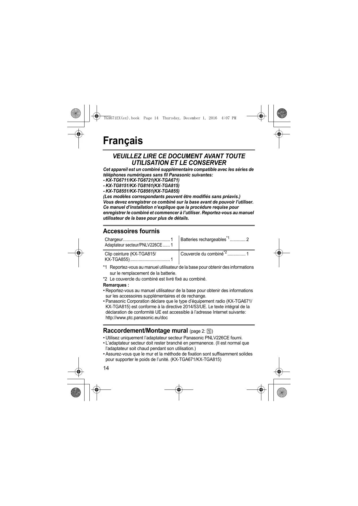 - Panasonic Corporation déclare que le type d’équipement radio (KX-TGA671/ KX-TGA815) est conforme à la directive 2014/53/UE. Le texte intégral de la déclaration de conformité UE est accessible à l’adresse Internet suivante: http://www.ptc.panasonic.eu/doc Raccordement/Montage mural (page 2: 1)