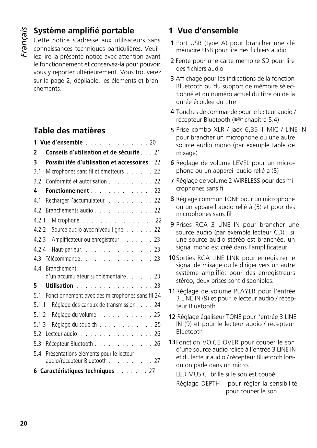 Vue d'ensemble 20 2 Conseils d'utilisation et de sécurité. 21 3 Possibilités d'utilisation et accessoires. 22 3.1 Microphones sans fil et émetteurs 22 3.2 Conformité et autorisation 22 4 Fonctionnement 22 4.1 Recharger l'accumulateur 22 4.2 Branchements audio 22 4.2.1 Microphone 22 4.2.2 Source audio avec niveau ligne 22 4.2.3 Amplificateur ou enregistreur 23 4.2.4 Haut-parleur. 23 4.3 Télécommande. 23 4.4 Branchement d'un accumulateur supplémentaire 23 5 Utilisation 23 5.1 Fonctionnement avec des microphones sans fil 24 5.1.1 Réglage des canaux de transmission. 24 5.1.2 Réglage du volume 25 5.1.3 Réglage du squelch 25 5.2 Lecteur audio 26 5.3 Récepteur Bluetooth 26 5.4 Présentations éléments pour le lecteur audio/récepteur Bluetooth 27 6 Caractéristiques techniques 27