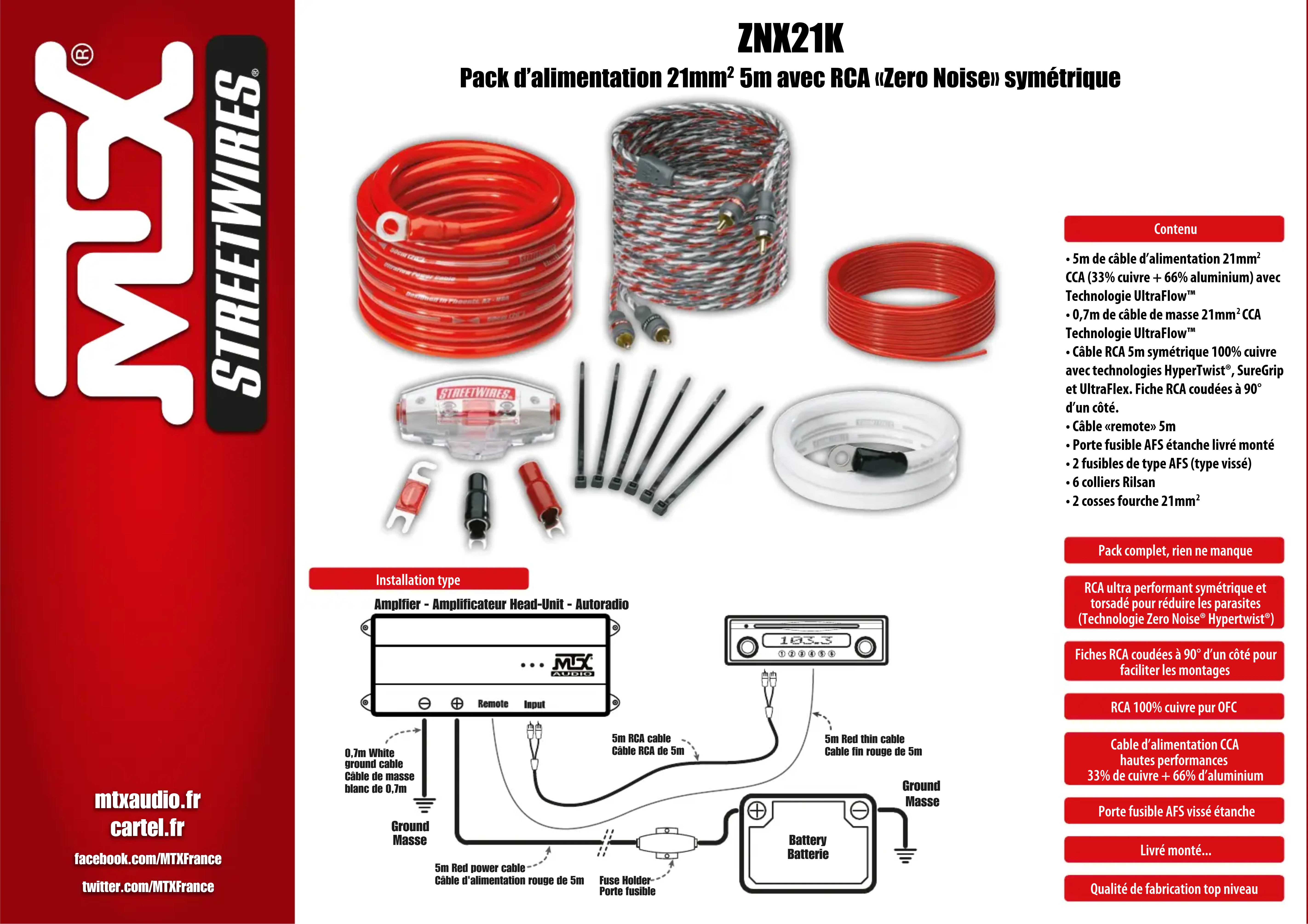 5m avec RCA «Zero Noise» symétrique Contenu Pack complet, rien ne manque Fiches RCA coudées à 90° d’un côté pour faciliter les montages RCA ultra performant symétrique et torsadé pour réduire les parasites (Technologie Zero Noise® Hypertwist®) Cable d’alimentation CCA hautes performances 33% de cuivre + 66% d’aluminium RCA 100% cuivre pur OFC Porte fusible AFS vissé étanche Livré monté... Qualité de fabrication top niveau Installation type