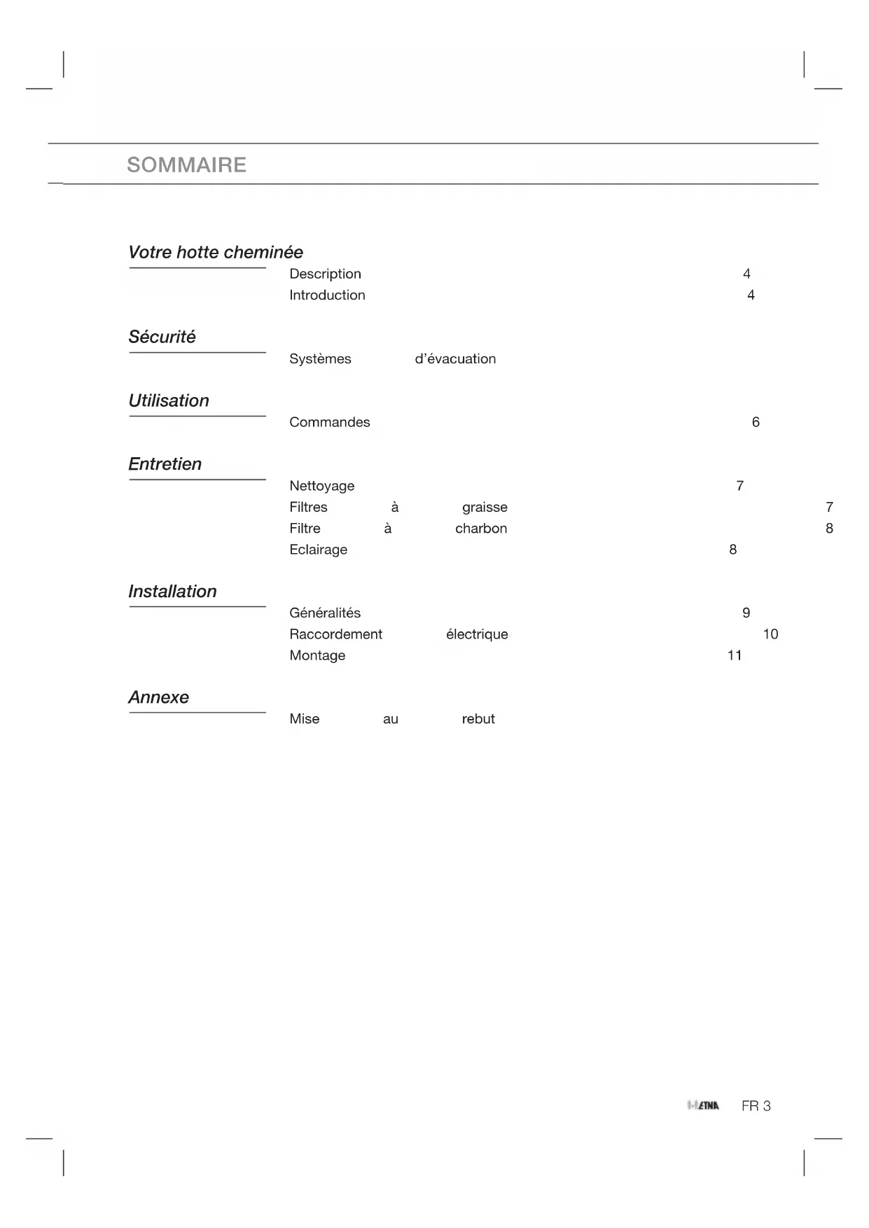 - L’éclairage s'éteint. UTILISATIONFR 7 Nettoyage Attention ! Avant toute intervention d'entretien, isolez la hotte de l'alimentation électrique en débranchant l'appareil ou en coupant le courant au compteur. La hotte doit être nettoyée régulièrement (au moins aussi souvent que les filtres à graisse), à l'intérieur comme à l'extérieur. Ne pas utiliser de produit abrasif. Ne pas utiliser d’alcool ! Attention ! Le non respect des recommandations de base pour le nettoyage de la hotte aspirante et le nettoyage/remplacement des filtres peut être à l'origine d'un incendie. Nous conseillons par conséquent de respecter ces instructions. Le constructeur décline toute responsabilité en cas de détérioration du moteur ou d’incendie lié à un entretien négligé ou au non respect des consignes de sécurité précédemment mentionnées. Hotte aspirante Nettoyez la hotte aspirante avec de l'eau savonneuse et un chiffon doux. Rincez ensuite à l'eau claire. N'utilisez pas de produits de nettoyage agressifs comme la soude. Frottez la peinture de votre hotte à la cire pour qu'elle conserve son brillant. Filtres à graisse métalliques Ils doivent être nettoyés une fois par mois (ou lorsque le système d’indication de saturation des filtres – éventuellement présent sur votre modèle – l'indique) avec des détergents non agressifs, à la main ou dans le lave-vaisselle à faible température et cycle rapide. Les ouvertures doivent être orientées vers le bas dans le lave-vaisselle pour permettre à l’eau de s’écouler. Les filtres en aluminium ternissent légèrement sous l'effet du passage au lave-vaisselle. Ceci est normal et n'affecte pas leur performance. Filtres à graisse Dépose des filtres à graisse Coupez le courant électrique ! Débranchez la fiche de la prise de courant ou coupez le courant à l’aide du disjoncteur du compteur électrique. Tirez le filtre à graisse vers vous et inclinez-le vers l’avant et vers le bas. ENTRETIENFR 8 Filtre à charbon Remplacement du filtre à charbon Vous devez toujours utiliser un filtre à charbon lorsque la hotte n’est pas raccordée à un conduit.