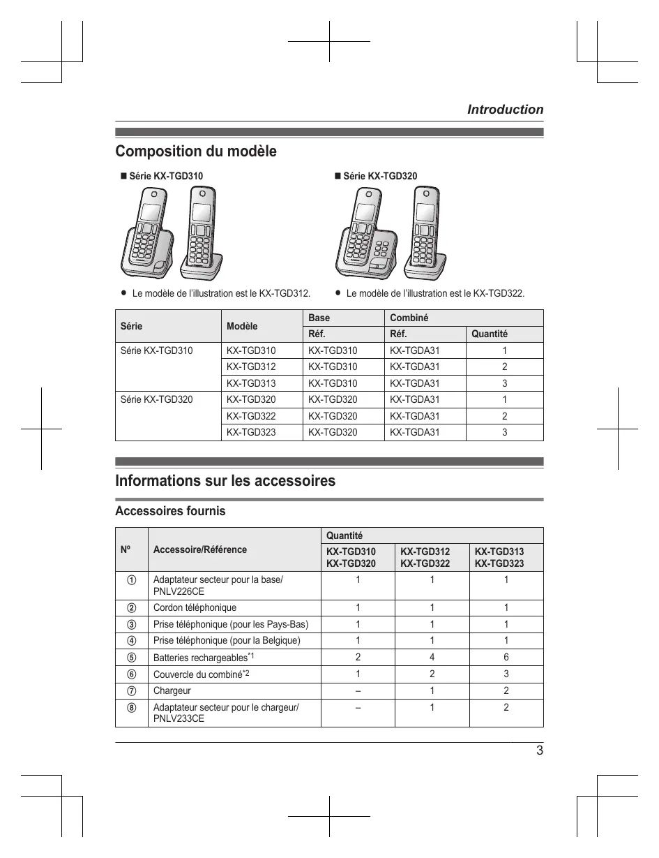 - Index Index Introduction Composition du modèle n Série KX-TGD310 n Série KX-TGD320 R Le modèle de l’illustration est le KX-TGD312. R Le modèle de l’illustration est le KX-TGD322. Série Modèle Série KX-TGD310 Série KX-TGD320 Base Combiné Réf. Réf. KX-TGD310 KX-TGD310 KX-TGDA31 Quantité p. 54