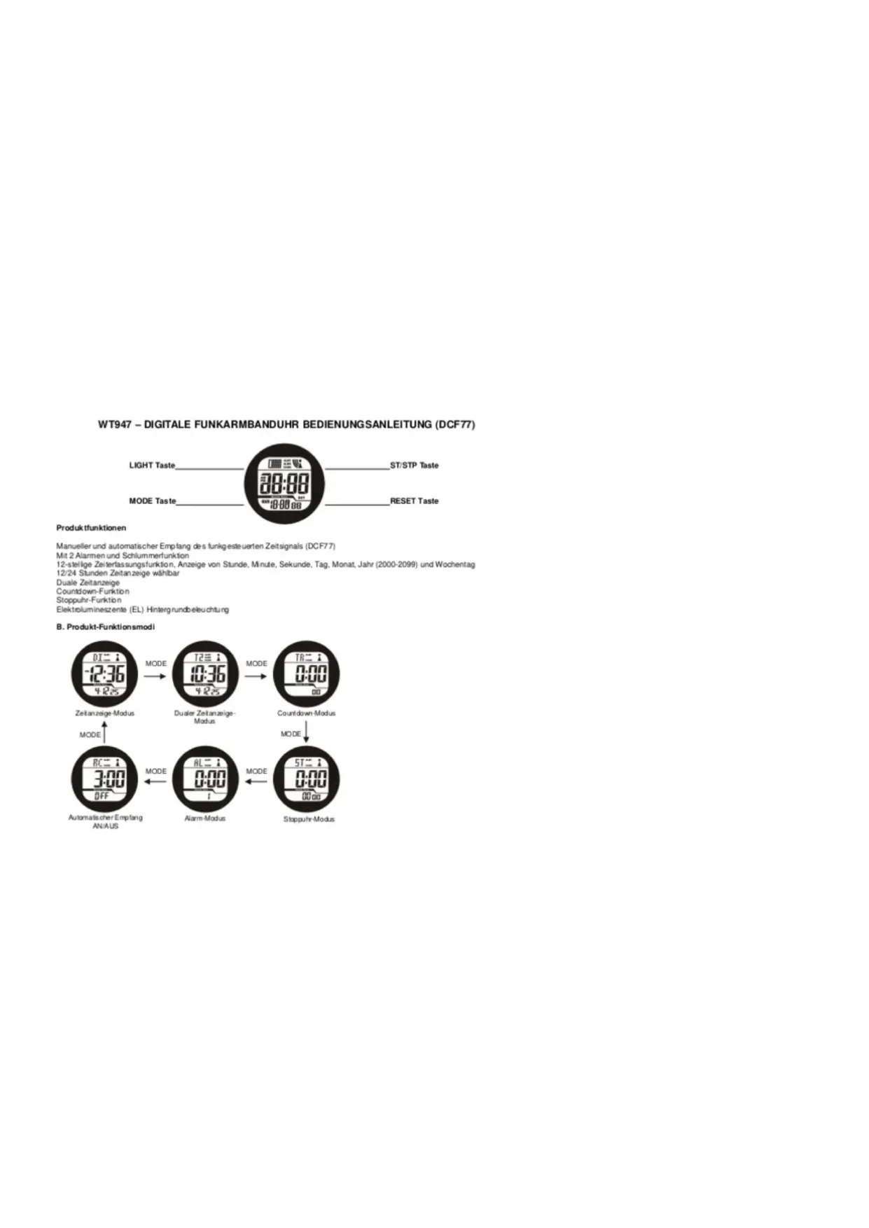 Caractéristiques du produit Réception manuelle et automatique du signal horaire radio-piloté (DCF77). Avec 2 alarmes et fonction rappel Fonction d’indication de l’heure à 12 chiffres, affichage de l’heure, des minutes, des secondes, du jour, du mois, de l’année (2000- 2099) et du jour de la semaine. Format 12/24 heures au choix Fonction double fuseau horaire Fonction compte à rebours Fonction chronomètre Rétroéclairage par électroluminescence (EL) B. Mode de fonctionnement du produit