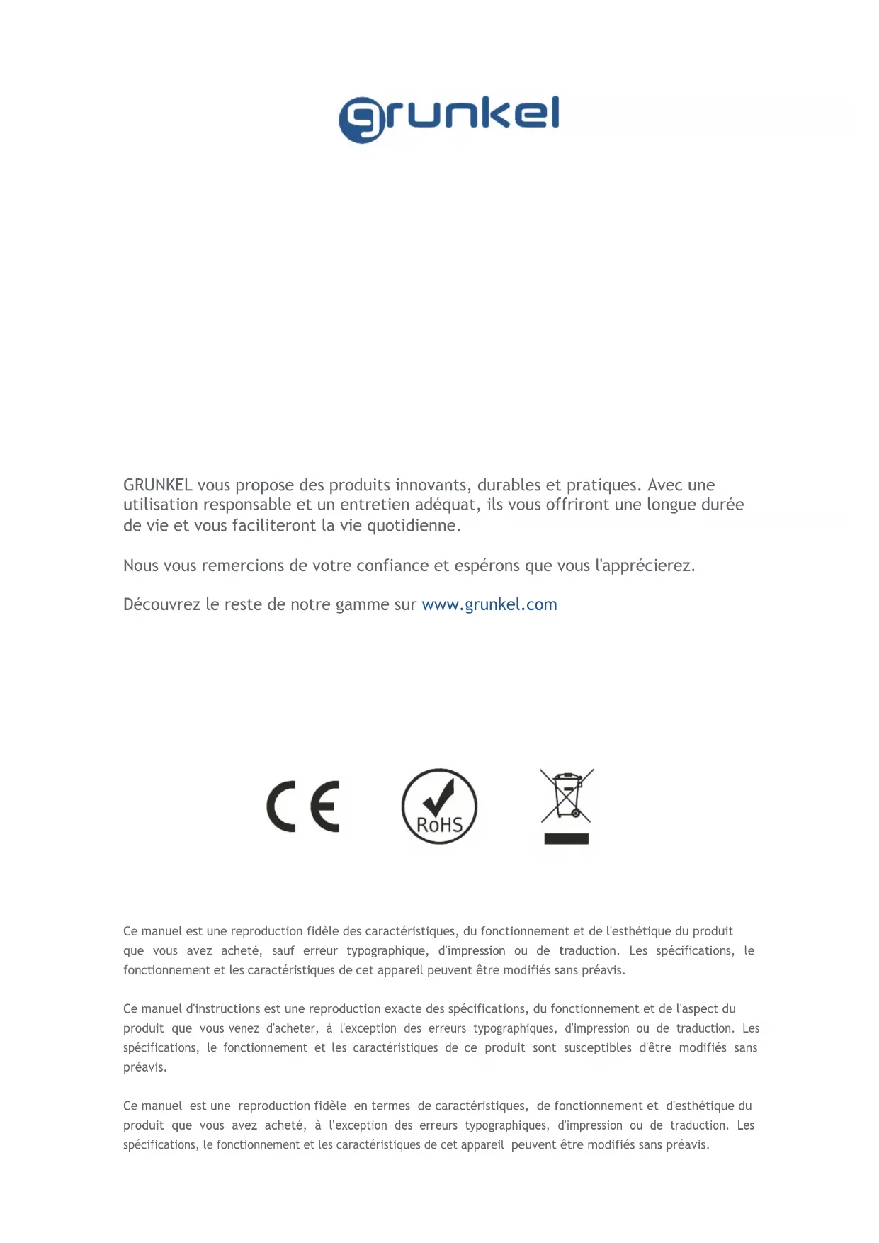 DÉCOUVREZ CE QUE NOUS POUVONS FAIRE POUR VOUS Àwww.grunkel.comGRUNKEL vous propose des produits innovants, durables et pratiques. Avec une utilisation responsable et un entretien adéquat, ils vous offriront une longue durée de vie et vous faciliteront la vie quotidienne. Nous vous remercions de votre confiance et espérons que vous l'apprécierez. Découvrez le reste de notre gamme sur www.grunkel.com