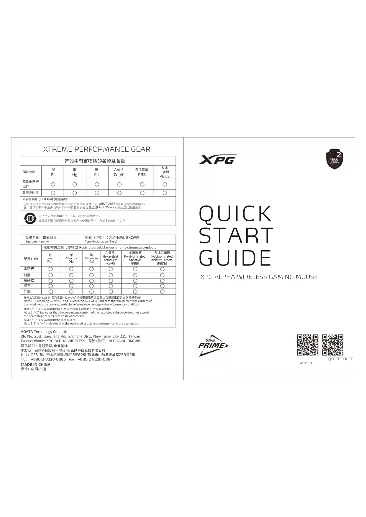 Le guide d’utilisation des dispositifs pour réseaux locaux doit inclure des instructions précises sur les restrictions susmentionnées, notamment : (i) les dispositifs fonctionnant dans la bande 5150-5250 MHz sont réservés uniquement pour une utilisation à l’intérieur afin de réduire les risques de brouillage préjudiciable aux systèmes de satellites mobiles utilisant les mêmes canaux; (ii) le gain maximal d'antenne permis pour les dispositifs utilisant les bandes de 5250 à 5 350 MHz et de 5470 à 5725 MHz doit être conforme à la limite de la p.i.r.e; (iii) le gain maximal d'antenne permis (pour les dispositifs utilisant la bande de 5 725 à 5 850 MHz) doit être conforme à la limite de la p.i.r.e. spécifiée pour l'exploitation point à point et l’exploitation non point à point, selon le cas; (iv) les pires angles d’inclinaison nécessaires pour rester conforme à l’exigence de la p.i.r.e. applicable au masque d’élévation, et énoncée à la section 6.2.2 3), doivent être clairement indiqués. (v) De plus, les utilisateurs devraient aussi être avisés que les utilisateurs de radars de haute puissance sont désignés utilisateurs principaux (c.-à-d., qu’ils ont la priorité) pour les bandes 5250-5350 MHz et 5650-5850 MHz et que ces radars pourraient causer du brouillage et/ou des dommages aux dispositifs LAN-EL. FOR PORTABLE DEVICE USAGE (<20m from body/SAR needed) Radiation Exposure Statement: The product comply with the Canada portable RF exposure limit set forth for an uncontrolled environment and are safe for intended operation as described in this manual. The further RF exposure reduction can be achieved if the product can be kept as far as possible from the user body or set the device to lower output power if such function is available. Déclaration d'exposition aux radiations: Le produit est conforme aux limites d'exposition pour les appareils portables RF pour les Etats-Unis et le Canada établies pour un environnement non contrôlé. Le produit est sûr pour un fonctionnement tel que décrit dans ce manuel. La réduction aux expositions RF peut être augmentée si l'appareil peut être conservé aussi loin que possible du corps de l'utilisateur ou que le dispositif est réglé sur la puissance de sortie la plus faible si une telle fonction est disponible. FOR MOBILE DEVICE USAGE (>20cm/low power) Radiation Exposure Statement: This equipment complies with ISED radiation exposure limits set forth for an uncontrolled environment. This equipment should be installed and operated with minimum distance 20cm between the radiator & your body. Déclaration d'exposition aux radiations: Cet équipement est conforme aux limites d'exposition aux rayonnements ISED établies pour un environnement non contrôlé. Cet équipement doit être installé et utilisé avec un minimum de 20 cm de distance entre la source de rayonnement et votre corps. Hereby ADATA XPG declares that the this device is in compliance with Directive 2014/53/EU Federal Communication Commission Interference Statement Radiation Exposure Statement:
