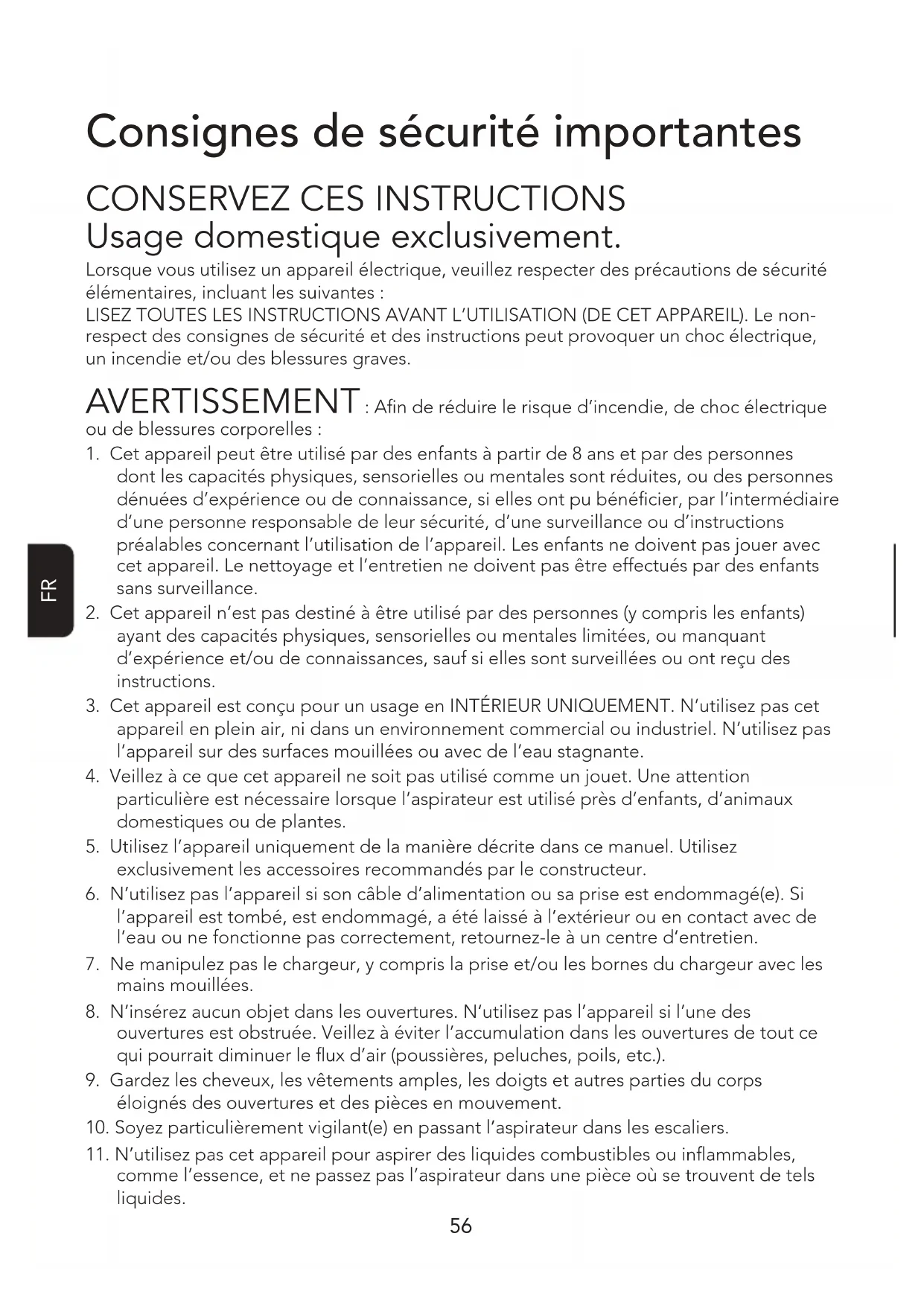 Usage domestique exclusivement. Lorsque vous utilisez un appareil électrique, veuillez respecter des précautions de sécurité élémentaires, incluant les suivantes: LISEZ TOUTES LES INSTRUCTIONS AVANT L’UTILISATION (DE CET APPAREIL). Le non- respect des consignes de sécurité et des instructions peut provoquer un choc électrique, un incendie et/ou des blessures graves.