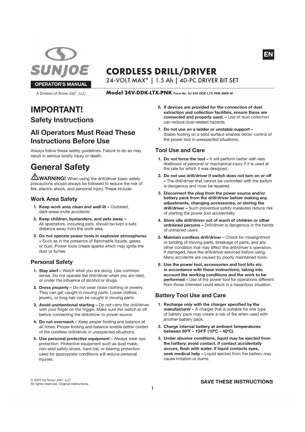 24VDDKLTXPNK - Perceuse Sun Joe - Notice d'utilisation et mode d'emploi gratuit