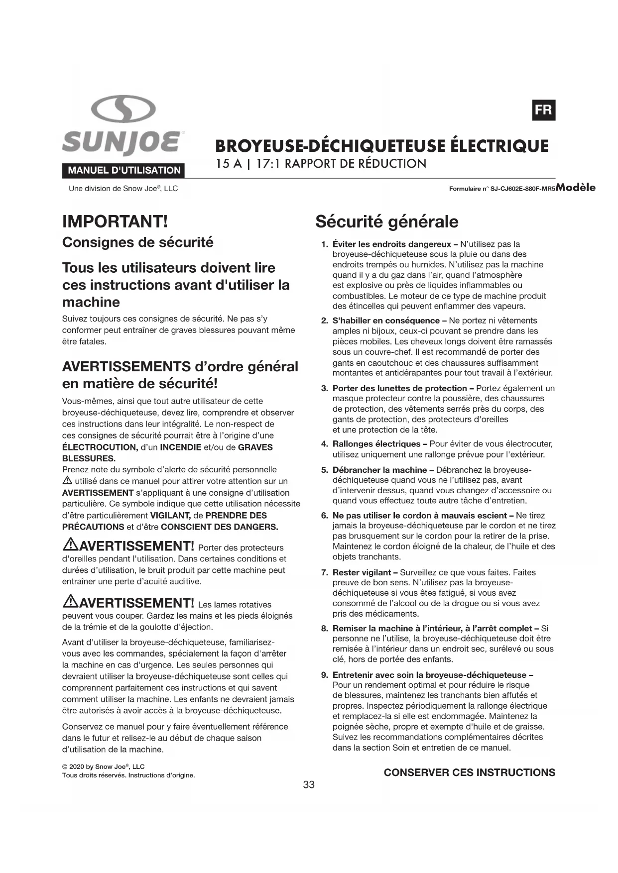 SP© 2020 by Snow Joe , LLCTous droits réservés. Instructions d’origine.