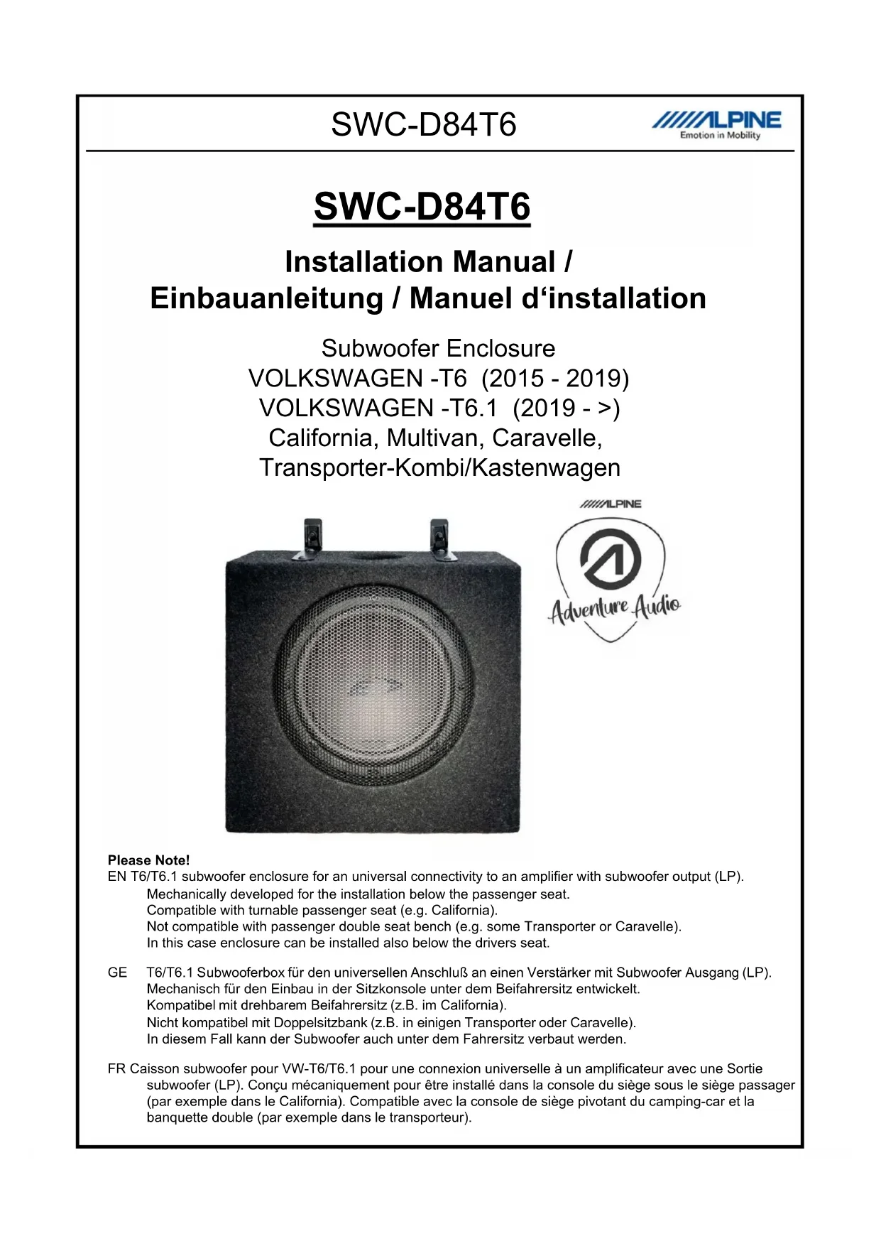 La console de siège T6 / T6.1 est équipée de différentes variantes de boîtes noires et d'unités relais/prises. En général, essayez de retirer les supports en métal et/ou en plastique et déplacez les boîtes noires et les relais/connecteurs des deux côtés pour générer l'espace nécessaire pour les caisson du subwoofer. 13SWC-D84T6 Please Note! EN This double voice coil subwoofer can be connected universally to an amplifier with subwoofer output (LP). GE Dieser Doppelschwingspulensubwoofer kann universal an einen Verstärker mit Subwooferausgang (LP) angeschlossen werden. FR Ce subwoofer à double bobine peut être connecté universellement à un amplificateur avec sortie subwoofer (LP).