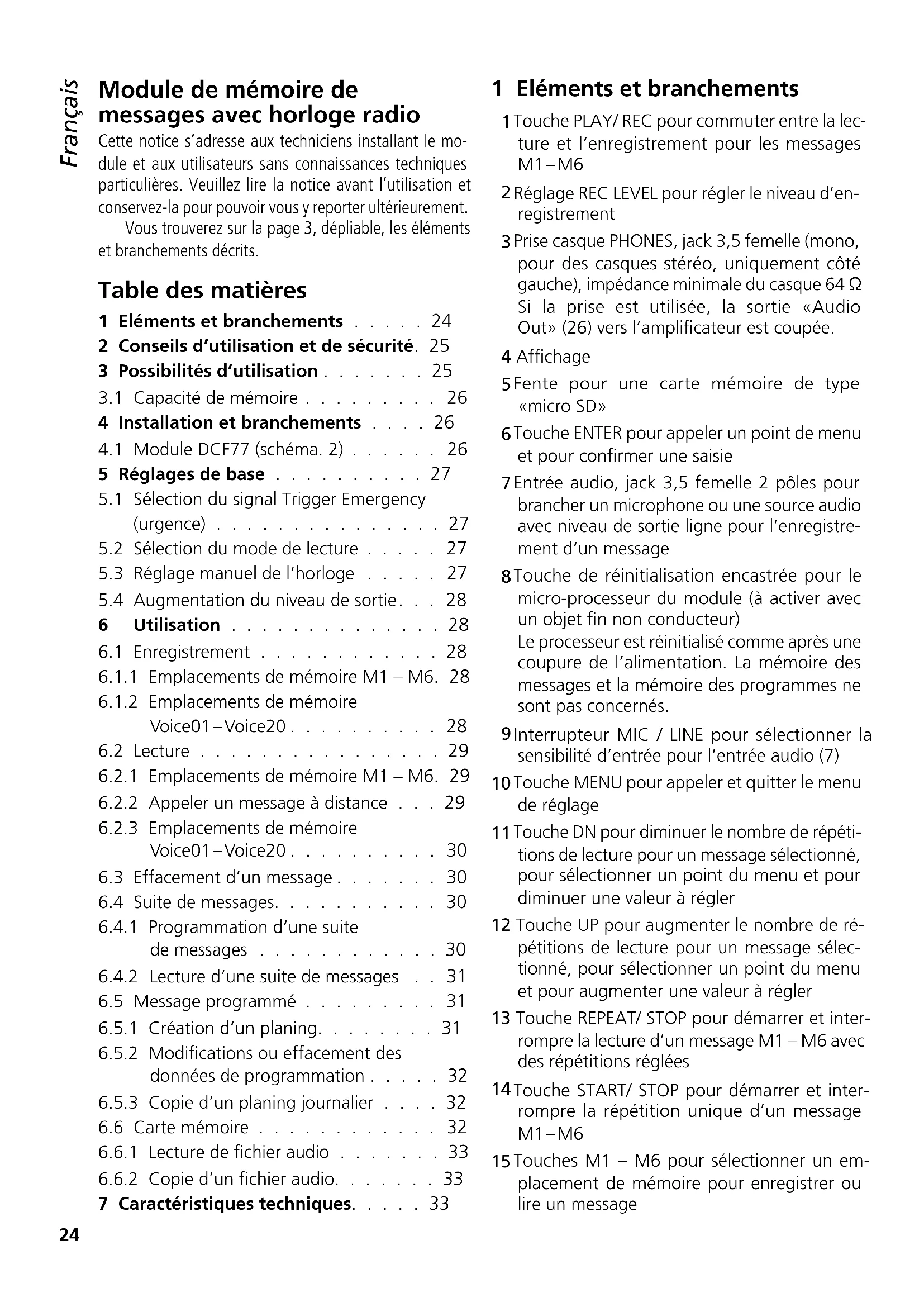 - Touches M1 – M6 pour sélectionner un em- placement de mémoire pour enregistrer ou lire un message Table des matières 1 Eléments et branchements p. 24