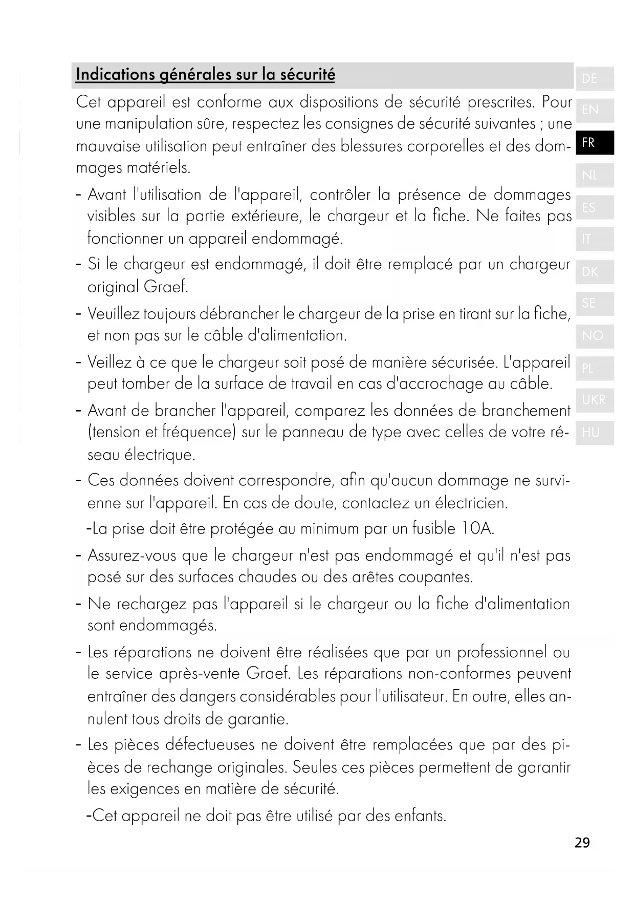 Indications générales sur la sécurité Cet appareil est conforme aux dispositions de sécurité prescrites. Pour une manipulation sûre, respectez les consignes de sécurité suivantes; une mauvaise utilisation peut entraîner des blessures corporelles et des dom- mages matériels. - Avant l'utilisation de l'appareil, contrôler la présence de dommages visibles sur la partie extérieure, le chargeur et la fiche. Ne faites pas fonctionner un appareil endommagé. - Si le chargeur est endommagé, il doit être remplacé par un chargeur original Graef. - Veuillez toujours débrancher le chargeur de la prise en tirant sur la fiche, et non pas sur le câble d'alimentation. - Veillez à ce que le chargeur soit posé de manière sécurisée. L'appareil peut tomber de la surface de travail en cas d'accrochage au câble. - Avant de brancher l'appareil, comparez les données de branchement (tension et fréquence) sur le panneau de type avec celles de votre ré- seau électrique. - Ces données doivent correspondre, afin qu'aucun dommage ne survi- enne sur l'appareil. En cas de doute, contactez un électricien. - La prise doit être protégée au minimum par un fusible 10A. - Assurez-vous que le chargeur n'est pas endommagé et qu'il n'est pas posé sur des surfaces chaudes ou des arêtes coupantes. - Ne rechargez pas l'appareil si le chargeur ou la fiche d'alimentation sont endommagés. - Les réparations ne doivent être réalisées que par un professionnel ou le service après-vente Graef. Les réparations non-conformes peuvent entraîner des dangers considérables pour l'utilisateur. En outre, elles an- nulent tous droits de garantie. - Les pièces défectueuses ne doivent être remplacées que par des pi- èces de rechange originales. Seules ces pièces permettent de garantir les exigences en matière de sécurité. - Cet appareil ne doit pas être utilisé par des enfants.30 - L'appareil et le chargeur doive être maintenus hors de portée des en- fants. - L’appareil peut être utilisé par des personnes à capacités physiques, sensorielles ou mentales réduites, ou ayant des lacunes en connais- sance et/ou en expérience, si elles ont été contrôlées ou qu'elles ont été formées à l'utilisation sûre de l'appareil et qu'elles ont compris les dangers en résultants. - Ne pas laisser jouer des enfants avec cet appareil. - L'appareil n'est pas conçu pour être utilisé avec une minuterie externe ou une télécommande séparée. - Les matériaux d'emballage ne doivent pas être utilisés pour jouer. Risque d'étouffement. - Avant l’assemblage, le démontage ou le nettoyage, débranchez tou- jours l’appareil du réseau, et également s’il n’est pas sous surveillance. - Maintenez l'appareil éloigné de la chaleur ou des arêtes coupantes qui pourraient entraîner des dommages. - Maintenez l'appareil éloigné d'autres appareils producteurs de cha- leur. - N'immergez pas l'appareil dans l'eau ou d'autres liquides. - N'utilisez pas l'appareil avec les mains mouillées. - N'exposez pas l'appareil à la pluie. - Ne stockez pas l'appareil en exposition directe aux rayons du soleil ou en présence d'une humidité élevée de l'air. - N'utilisez pas cet appareil si une des ouvertures est obstruée. - N'utilisez pas l'appareil pour collecter des liquides inflammables, des allumettes, des braises de cigarettes, des cendres chaudes ou d'autres matériaux brûlants, inflammables ou dégageant de la fumée. - N'utilisez pas cet appareil pour prendre des objets durs, tranchants tels que le verre ou des aiguilles, entre autres. - N'utilisez pas cet appareil pour aspirer de l'eau ou d'autres liquides, car cela entraîne un danger de choc électrique. - Ne faites jamais fonctionner l'appareil sans filtre.31