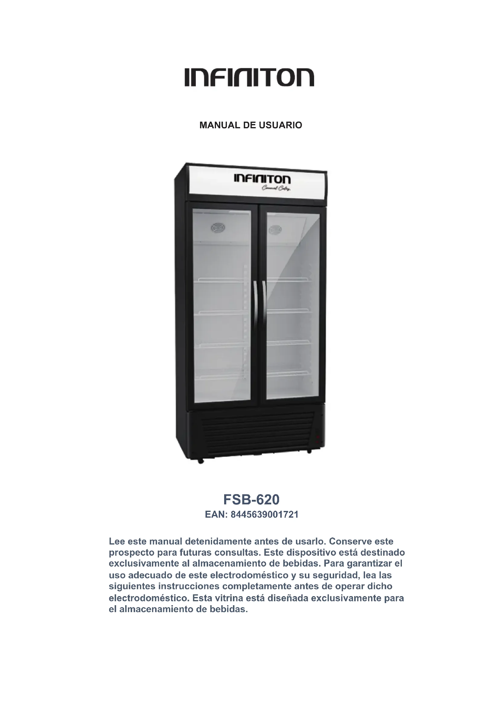 WORLD ELECTRONIC 1nF1n1TonLisez attentivement ce manuel avant de l'utiliser. Conservez cette notice pour référence future. Cet appareil est destiné exclusivement au stockage de boissons. Pour garantir une utilisation correcte de cet appareil et votre sécurité, suivez les instructions ci-dessous complètement avant de faire fonctionner l'appareil. Cette vitrine est conçue exclusivement pour le stockage de boissons. FSB-620 EAN: 8445639001721 MANUEL D'UTILISATION1
