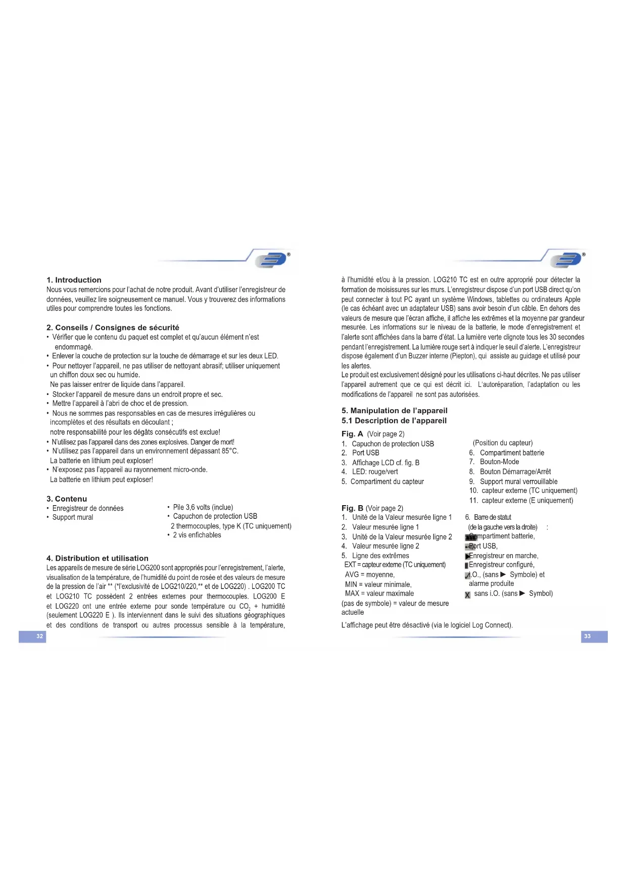 à l’humidité et/ou à la pression. LOG210 TC est en outre approprié pour détecter la formation de moisissures sur les murs. L’enregistreur dispose d’un port USB direct qu’on peut connecter à tout PC ayant un système Windows, tablettes ou ordinateurs Apple (le cas échéant avec un adaptateur USB) sans avoir besoin d’un câble. En dehors des valeurs de mesure que l’écran afche, il afche les extrêmes et la moyenne par grandeur mesurée. Les informations sur le niveau de la batterie, le mode d’enregistrement et l’alerte sont afchées dans la barre d’état. La lumière verte clignote tous les 30 secondes pendant l’enregistrement. La lumière rouge sert à indiquer le seuil d’alerte. L’enregistreur dispose également d’un Buzzer interne (Piepton), qui assiste au guidage et utilisé pour les alertes. Le produit est exclusivement désigné pour les utilisations ci-haut décrites. Ne pas utiliser l’appareil autrement que ce qui est décrit ici. L‘autoréparation, l’adaptation ou les modications de l’appareil ne sont pas autorisées. Fig. A (Voir page 2)