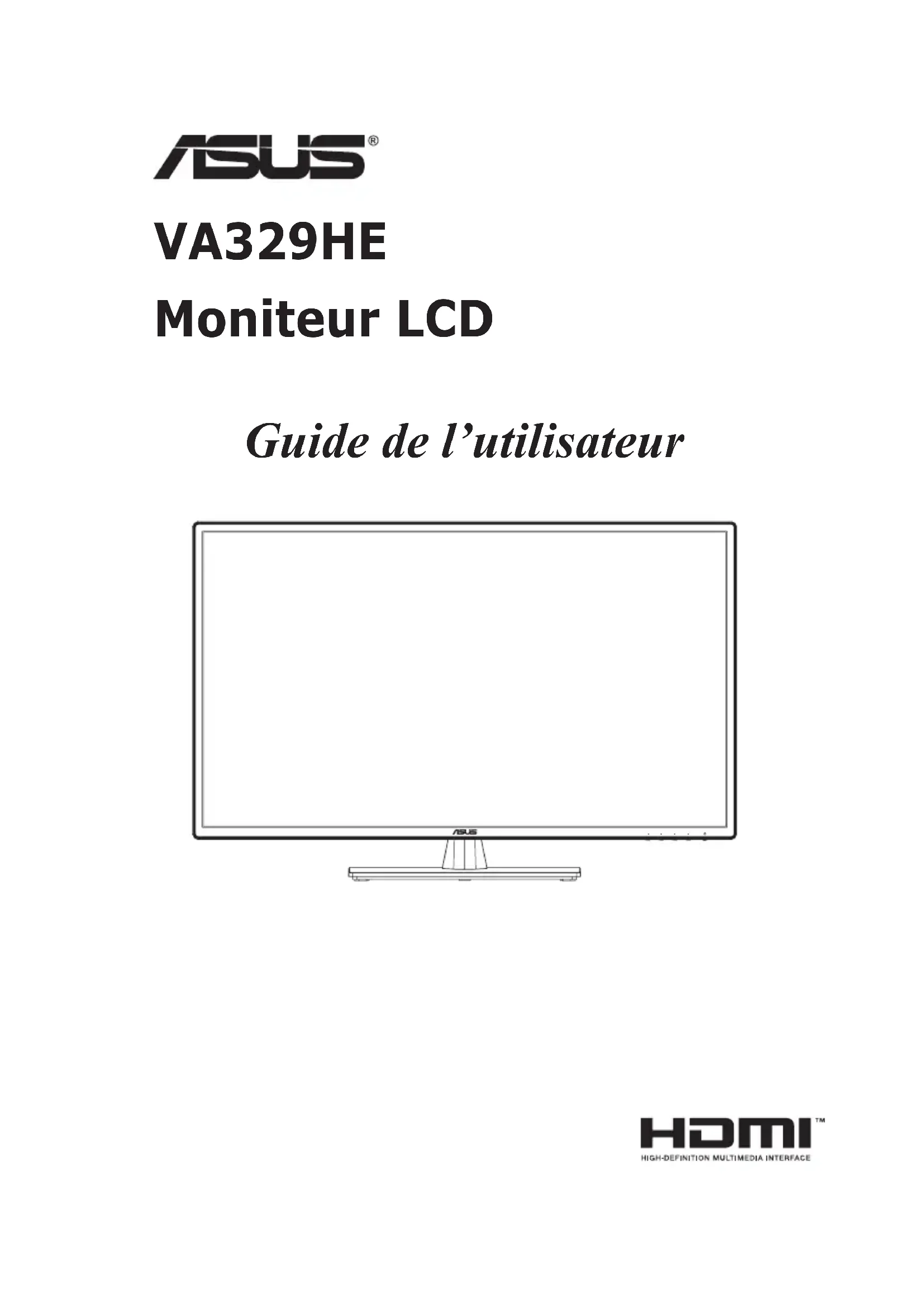 VA329HE Moniteur LCD Guide de l’utilisateurii Copyright © 2021 ASUSTeK COMPUTER INC. Tous droits réservés. Aucune partie de ce manuel, y compris les produits et logiciels qui y sont décrits, ne peut être reproduite, transmise, transcrite, stockée dans un système de récupération ou traduite dans une langue quelconque sous quelque forme ou par quelque moyen que ce soit, à l’exception de la documentation conservée par l’acheteur à des ns de sauvegarde, sans l’autorisation écrite expresse de ASUSTeK COMPUTER INC. (« ASUS »). La garantie du produit ou le service ne sera pas prolongé si : (1) le produit est réparé, modié ou altéré, sauf si cette réparation, modication ou altération est autorisée par écrit par ASUS ; ou (2) le numéro de série du produit est effacé ou manquant. ASUS FOURNIT CE MANUEL « TEL QUEL » SANS GARANTIE D’AUCUNE SORTE, EXPRESSE OU IMPLICITE, Y COMPRIS, MAIS SANS S’Y LIMITER, LES GARANTIES OU CONDITIONS IMPLICITES DE QUALITÉ MARCHANDE OU D’ADÉQUATION À UN USAGE PARTICULIER. EN AUCUN CAS ASUS, SES DIRECTEURS, DIRIGEANTS, EMPLOYÉS OU AGENTS NE POURRONT ÊTRE TENUS RESPONSABLES DE TOUT DOMMAGE INDIRECT, SPÉCIAL, ACCIDENTEL OU CONSÉCUTIF (Y COMPRIS LES DOMMAGES POUR PERTE DE PROFITS, PERTE D’ACTIVITÉ, PERTE D’UTILISATION OU DE DONNÉES, INTERRUPTION D’ACTIVITÉ ET AUTRES), MÊME SI ASUS A ÉTÉ INFORMÉ DE LA POSSIBILITÉ DE TELS DOMMAGES RÉSULTANT DE L’UTILISATION DE CE PRODUIT.DE LA POSSIBILITÉ DE TELS DOMMAGES RÉSULTANT DE TOUT DÉFAUT OU ERREUR DANS CE MANUEL OU PRODUIT. LES SPÉCIFICATIONS ET LES INFORMATIONS CONTENUES DANS CE MANUEL SONT FOURNIES À TITRE D’INFORMATION UNIQUEMENT, ET SONT SUSCEPTIBLES D’ÊTRE MODIFIÉES À TOUT MOMENT SANS PRÉAVIS, ET NE DOIVENT PAS ÊTRE INTERPRÉTÉES COMME UN ENGAGEMENT DE LA PART D’ASUS. ASUS N’ASSUME AUCUNE RESPONSABILITÉ POUR TOUTE ERREUR OU INEXACTITUDE POUVANT APPARAÎTRE DANS CE MANUEL, Y COMPRIS LES PRODUITS ET LOGICIELS QUI Y SONT DÉCRITS. Les produits et les noms de sociétés apparaissant dans ce manuel peuvent ou non être des marques déposées ou des droits d’auteur de leurs sociétés respectives, et ne sont utilisés qu’à des ns d’identication ou d’explication et dans l’intérêt des propriétaires, sans intention d’infraction.ge Première édition Mars 2021iii Sommaire Sommaire .......................................................................................... iii Avis.................................................................................................... iv Informations sur la sécurité ............................................................... vi Entretien et nettoyage ...................................................................... vii Services de reprise ..........................................................................viii
