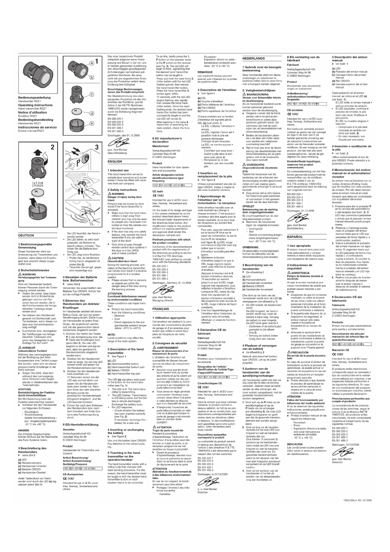 Utilisez exclusivement une pile de type CR2025. Veillez à insérer la pile avec la polarité correcte. 5 Apprentissage de l’émetteur par la motorisation / le récepteur Votre émetteur travaille avec un code tournant qui change à chaque émission. C’est pourquoi l’émetteur doit être appris avec le bouton souhaité, et ce pour tous les récepteurs qui doivent être commandés. Pour cela, appuyez brièvement 1. sur le bouton P situé sur le capot de motorisation ou sur la touche P du récepteur (voir figure 3). La DEL rouge commence à clignoter pour sig- naliser que le bouton d’émetteur souhaité peut être appris. Maintenez le bouton 2. d’émetteur jusqu’à ce que la DEL rouge clignote rapide- ment, puis relâchez le bouton d’émetteur. Appuyez à nouveau sur le 3. bouton d’émetteur dans les 15 secondes qui suivent, jusqu’à ce que la DEL rouge clignote très rapidement, puis relâchez le bouton d’émetteur. Lorsque la DEL cesse de clig- noter très rapidement, le bouton d’émetteur souhaité a été programmé avec succès et la DEL rouge s’allume de façon constante. Une fois l’apprentissage de 4. l’émetteur et/ou l’extension du système radio terminé(e), effectuez un essai de fonction- nement. 6 Déclaration CE du fabricant Fabricant Verkaufsgesellschaft KG Upheider Weg 94-98 D-33803 Steinhagen Produit Emetteur pour motorisation et accessoires Désignation de l’article/ Identification de l’article/Type d’appareil/Fréquence RSZ1 RSZ1-433 RSZ1-433 433 MHz Caractéristiques CE Intended for use in all EU coun- tries, Norway, Switzerland and others. Dans la version que nous commer- cialisons, le produit nommé ci- dessus satisfait, du fait de sa con- ception et de sa construction, aux dispositions correspondantes pré- cisées dans les directives citées ci-dessous. Si des modifications sont apportées sans notre autori- sation, cette déclaration perd toute validité. Dispositions auxquelles correspond le produit: La conformité du produit nommé ci-dessus aux dispositions de l’article 3 des directives R & TTE 1999/5/EG a été démontrée par le respect des normes suivantes: EN 300 220-1 EN 300 220-2 EN 300 220-3 EN 301 489-1 EN 301 489-3 Steinhagen, le 01/12/2008 p. o. Axel Becker Direction DEUTSCH 1 Bestimmungsgemäße Verwendung Dieser Handsender dient zur Ansteuerung von Torantrieben und Zubehör, wenn diese mit Empfän- gern aus unserem Hause ausge- stattet sind. 2 Sicherheitshinweise WARNUNG Verletzungsgefahr bei Torbewe- gung Wird der Handsender bedient, können Personen durch die Torbe- wegung verletzt werden. Stellen Sie sicher, dass Hand-