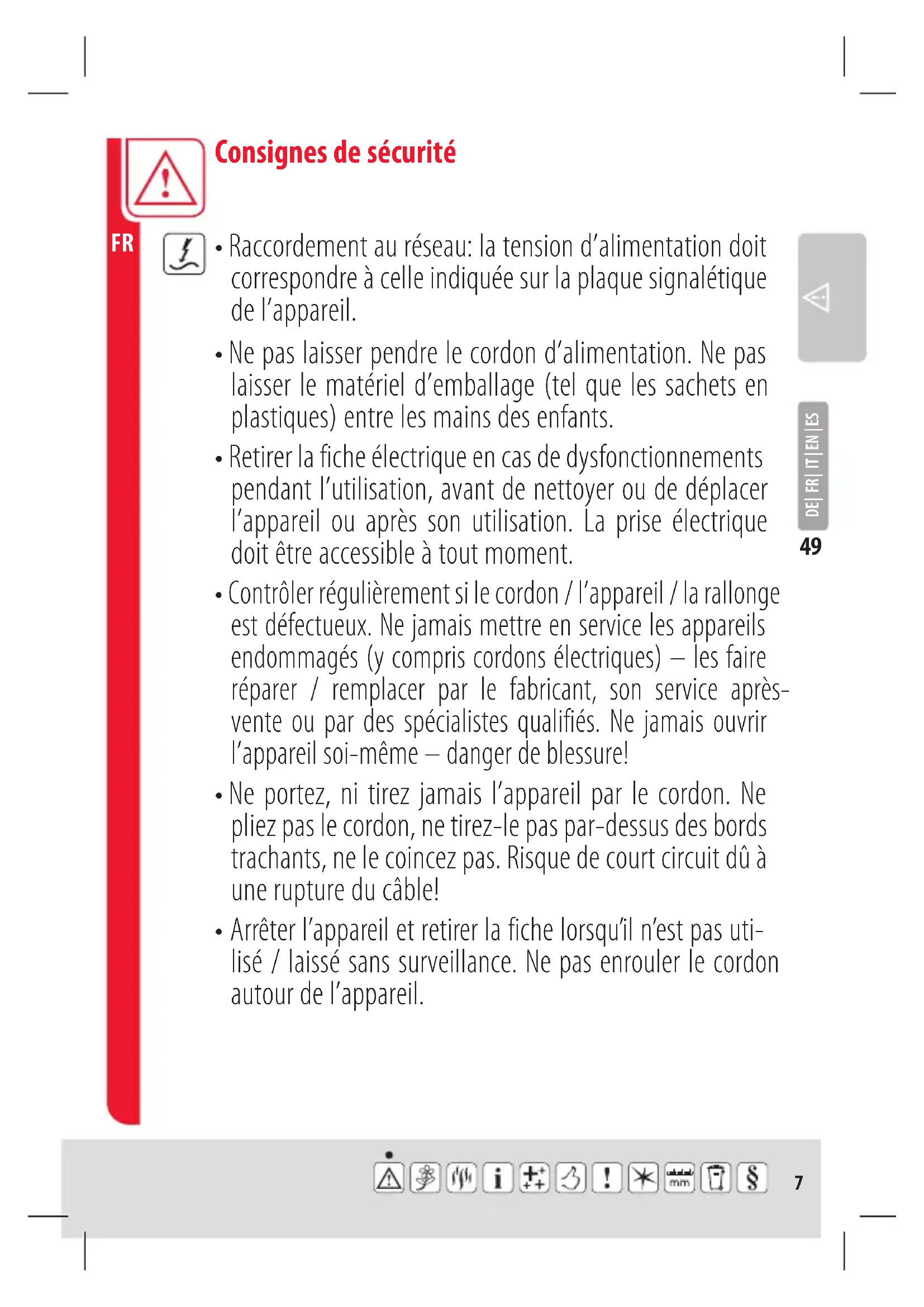 - Arrêter l’appareil et retirer la fiche lorsqu’il n’est pas uti- lisé / laissé sans surveillance. Ne pas enrouler le cordon autour de l’appareil. FR8 Consignes de sécurité