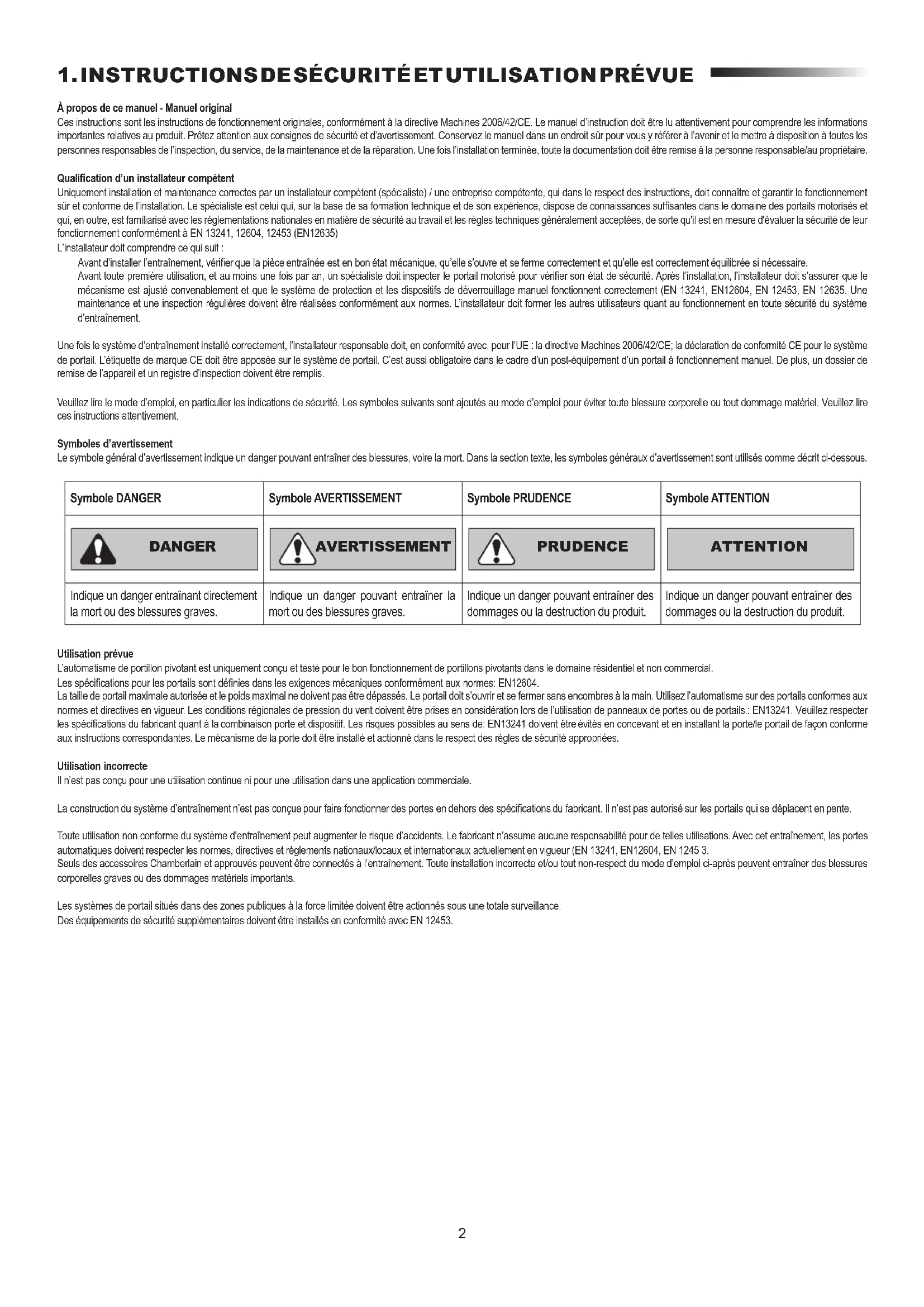 À propos de ce manuel - Manuel original Ces instructions sont les instructions de fonctionnement originales, conformément à la directive Machines 2006/42/CE. Le manuel d’instruction doit être lu attentivement pour comprendre les informations importantes relatives au produit. Prêtez attention aux consignes de sécurité et d’avertissement. Conservez le manuel dans un endroit sûr pour vous y référer à l’avenir et le mettre à disposition à toutes les personnes responsables de l’inspection, du service, de la maintenance et de la réparation. Une fois l’installation terminée, toute la documentation doit être remise à la personne responsable/au propriétaire. Qualication d’un installateur compétent Uniquement installation et maintenance correctes par un installateur compétent (spécialiste) / une entreprise compétente, qui dans le respect des instructions, doit connaître et garantir le fonctionnement sûr et conforme de l’installation. Le spécialiste est celui qui, sur la base de sa formation technique et de son expérience, dispose de connaissances sufsantes dans le domaine des portails motorisés et qui, en outre, est familiarisé avec les réglementations nationales en matière de sécurité au travail et les règles techniques généralement acceptées, de sorte qu'il est en mesure d'évaluer la sécurité de leur fonctionnement conformément à EN 13241, 12604, 12453 (EN12635) L’installateur doit comprendre ce qui suit : Avant d’installer l’entraînement, vérier que la pièce entraînée est en bon état mécanique, qu’elle s’ouvre et se ferme correctement et qu’elle est correctement équilibrée si nécessaire. Avant toute première utilisation, et au moins une fois par an, un spécialiste doit inspecter le portail motorisé pour vérier son état de sécurité. Après l’installation, l’installateur doit s’assurer que le mécanisme est ajusté convenablement et que le système de protection et les dispositifs de déverrouillage manuel fonctionnent correctement (EN 13241, EN12604, EN 12453, EN 12635. Une maintenance et une inspection régulières doivent être réalisées conformément aux normes. L’installateur doit former les autres utilisateurs quant au fonctionnement en toute sécurité du système d’entraînement. Une fois le système d’entraînement installé correctement, l’installateur responsable doit, en conformité avec, pour l’UE : la directive Machines 2006/42/CE; la déclaration de conformité CE pour le système de portail. L’étiquette de marque CE doit être apposée sur le système de portail. C’est aussi obligatoire dans le cadre d’un post-équipement d’un portail à fonctionnement manuel. De plus, un dossier de remise de l’appareil et un registre d’inspection doivent être remplis. Veuillez lire le mode d’emploi, en particulier les indications de sécurité. Les symboles suivants sont ajoutés au mode d’emploi pour éviter toute blessure corporelle ou tout dommage matériel. Veuillez lire ces instructions attentivement. Symboles d’avertissement Le symbole général d’avertissement indique un danger pouvant entraîner des blessures, voire la mort. Dans la section texte, les symboles généraux d’avertissement sont utilisés comme décrit ci-dessous. Utilisation prévue L’automatisme de portillon pivotant est uniquement conçu et testé pour le bon fonctionnement de portillons pivotants dans le domaine résidentiel et non commercial. Les spécications pour les portails sont dénies dans les exigences mécaniques conformément aux normes: EN12604. La taille de portail maximale autorisée et le poids maximal ne doivent pas être dépassés. Le portail doit s’ouvrir et se fermer sans encombres à la main. Utilisez l’automatisme sur des portails conformes aux normes et directives en vigueur. Les conditions régionales de pression du vent doivent être prises en considération lors de l’utilisation de panneaux de portes ou de portails.: EN13241. Veuillez respecter les spécications du fabricant quant à la combinaison porte et dispositif. Les risques possibles au sens de: EN13241 doivent être évités en concevant et en installant la porte/le portail de façon conforme aux instructions correspondantes. Le mécanisme de la porte doit être installé et actionné dans le respect des règles de sécurité appropriées. Utilisation incorrecte Il n’est pas conçu pour une utilisation continue ni pour une utilisation dans une application commerciale. La construction du système d’entraînement n’est pas conçue pour faire fonctionner des portes en dehors des spécications du fabricant. Il n’est pas autorisé sur les portails qui se déplacent en pente. Toute utilisation non conforme du système d’entraînement peut augmenter le risque d’accidents. Le fabricant n’assume aucune responsabilité pour de telles utilisations. Avec cet entraînement, les portes automatiques doivent respecter les normes, directives et règlements nationaux/locaux et internationaux actuellement en vigueur (EN 13241, EN12604, EN 1245 3. Seuls des accessoires Chamberlain et approuvés peuvent être connectés à l’entraînement. Toute installation incorrecte et/ou tout non-respect du mode d’emploi ci-après peuvent entraîner des blessures corporelles graves ou des dommages matériels importants. Les systèmes de portail situés dans des zones publiques à la force limitée doivent être actionnés sous une totale surveillance. Des équipements de sécurité supplémentaires doivent être installés en conformité avec EN 12453. Symbole DANGER Symbole AVERTISSEMENT Symbole PRUDENCE Symbole ATTENTION DANGER AVERTISSEMENT PRUDENCE ATTENTION Indique un danger entraînant directement la mort ou des blessures graves. Indique un danger pouvant entraîner la mort ou des blessures graves. Indique un danger pouvant entraîner des dommages ou la destruction du produit. Indique un danger pouvant entraîner des 