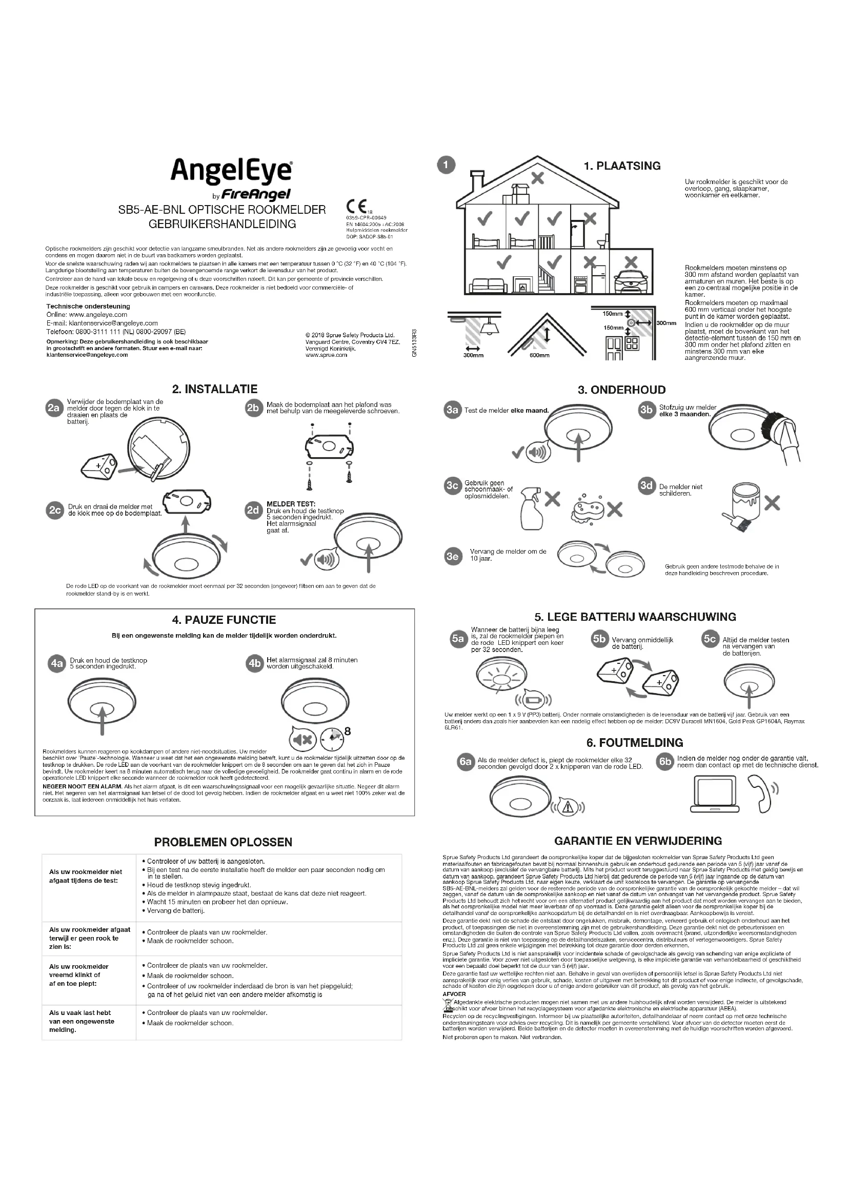 SB5-AE-BNL Les détecteurs de fumée optiques conviennent pour détecter des incendies lents couvants. Tout comme d’autres détecteurs de fumée, ils sont enclins aux fausses alarmes provoquées par la vapeur. Il ne faut donc pas les installer à proximité d’une salle de bains. Pour une alerte la plus précoce possible, il est recommandé d’installer des détecteurs de fumée dans toutes les pièces où la température est comprise entre 0 et 40 °C. Toute exposition prolongée à des températures hors de cette plage aura pour effet de réduire la durée de vie du produit. A des fins de conformité, vérifiez les réglementations locales relatives aux bâtiments et aux incendies pour votre propriété. Ce détecteur de fumée convient pour être installé dans les mobile-homes, camping-cars et caravanes. Ce détecteur de fumée n’est pas conçu pour une utilisation non résidentielle, commerciale ou industrielle quelconque, ni pour toute autre utilisation autre que celle décrite. © 2018 Sprue Safety Products Ltd.Vanguard Centre, Coventry CV4 7EZ,Royaume-Uni. www.sprue.com0359-CPR-00649 EN 14604:2005 +AC:2008 Dispositifs détecteurs de fuméeDOP : SADOP-SB5-01 Support technique :En ligne : www.angeleye.comE-mail : supporttechnique@angeleye.frTéléphone : 0800 940 078Remarque : ce manuel utilisateur est également disponible en caractères plus grands et dans d’autres formats. Veuillez nous écrire à l’adresse supporttechnique@angeleye.fr ou nous appeler au 0800 940 078 pour plus d’informations.GN5133R3 Sprue Safety Products Ltd garantit à l’acheteur initial que son détecteur de fumée est exempt de tout défaut materiel et de fabrication dans le cadre d’une utilisation domestique et dans des conditions normales, pour une période de 5 (cinq) ans à compter de la date d’achat (à l'exclusion de la pile remplaçable). À condition que le produit soit renvoyé à Sprue Safety Products avec la preuve d'achat datée, Sprue Safety Products Ltd accepte de remplacer gratuitement l’appareil, à sa discrétion, pendant la période de 5 (cinq) ans à partir de la date d’achat. La garantie sur tout remplacement de détecteur SB5-AE-BNL durera jusqu’à la fin de la période de garantie d’origine concernant le détecteur acheté initialement (soit à partir de la date d’achat initiale et non à compter de la date de réception du produit de remplacement). Sprue Safety Products Ltd se réserve le droit de fournir un autre produit similaire à celui qui doit être remplacé si le modèle d’origine n’est plus disponible ou n’est pas en stock. Cette garantie s’applique à l’acheteur initial à partir de la date de l’achat initial et n’est pas transférable. Une preuve d’achat datée est requise. Cette garantie ne couvre pas les dommages résultant d’un accident, d’une mauvaise utilisation, d’un démontage, d’abus ou d’un manque de soin raisonnable relatif au produit, ou d'utilisations non conformes au manuel utilisateur. Elle ne couvre pas les événements ou les conditions en dehors du contrôle de Sprue Safety Products Ltd, tels que des cas de force majeure (incendie, conditions climatiques défavorables, etc.). Elle ne s’applique pas aux magasins de détail, aux centres de service, aux distributeurs ou aux agents. Sprue Safety Products Ltd ne reconnaîtra aucune modification à la présente garantie apportée par des tiers. Sprue Safety Products Ltd décline toute responsabilité en cas de dommages accessoires ou indirects dus au non-respect des clauses expresses ou implicites de la garantie. Sauf dans la mesure où cela est interdit par la loi en vigueur, toute garantie implicite de qualité marchande ou d’adéquation à un usage particulier est limitée à une durée de 5 (cinq) ans. Cette garantie n’affecte pas vos droits statutaires. Sauf en cas de décès ou de dommages corporels, Sprue Safety Products Ltd ne peut être tenue responsable de toute perte d’utilisation, de tout dommage, de tout coût ou toute dépense concernant ce produit ou de tout dommage indirect, ou d’une perte consécutive, de dommages ou de frais encourus par vous ou tout autre utilisateur de ce produit.MISE AU REBUT Les produits électriques usagés ne doivent pas être éliminés avec les ordures ménagères. Le détecteur est parfaitement adapté au processus de recyclage des déchets d’équipements électriques et électroniques (DEEE). Procéder au recyclage dans les installations existantes. Consulter l’autorité locale compétente, votre détaillant ou contacter notre équipe de support technique pour en savoir plus sur le recyclage/ la mise au rebut, car des variantes peuvent exister localement. Les piles doivent être retirées avant d’éliminer le détecteur. Les piles et le détecteur doivent être mis au rebut conformément à la réglementation locale. Ne pas tenter d’ouvrir. Ne pas brûler.