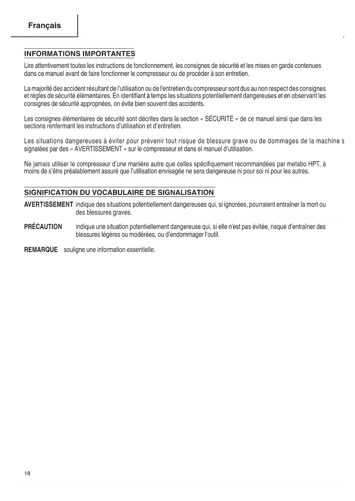 Do not disassemble check valve while air is in tank - empty the all the air out of the tank before dissasembly. There is excessive moisture in the air discharge. There is excessive water in the air tank. The humidity is high. Drain the tank to remove water. Move the compressor to an area of less humidity or use an air line fi lter to reduce moisture discharge in the tank. Air is leaking from the compressor. The hose connection is loose or improperly sealed. The air hose is broken or damaged. Ensure connections are sealed with thread sealing tape and tightened. Replace the air hose. The compressor runs continuously The tank drain valve is open. The pressure switch is defective. The usage is excessive. Ensure the tank drain valve is closed. Take the compressor to a service center. Decrease the amount of tool run-time; the compressor is not large enough to supply the air requirement of the tool. The compressor vibrates. The compressor mounting bolts are loose. Tighten mounting bolts. The air output is lower than normal. The inlet valves are broken. The connections are leaking. Take the compressor to a service center. Apply thread sealing tape to fi tting and tighten. 00BookEC914SNA.indb1700BookEC914SNA.indb17 2020/06/0813:46:342020/06/0813:46:3418 Français INFORMATIONS IMPORTANTES Lire attentivement toutes les instructions de fonctionnement, les consignes de sécurité et les mises en garde contenues dans ce manuel avant de faire fonctionner le compresseur ou de procéder à son entretien. La majorité des accident résultant de l’utilisation ou de l’entretien du compresseur sont dus au non respect des consignes et règles de sécurité élémentaires. En identifi ant à temps les situations potentiellement dangereuses et en observant les consignes de sécurité appropriées, on évite bien souvent des accidents. Les consignes élémentaires de sécurité sont décrites dans la section « SÉCURITÉ » de ce manuel ainsi que dans les sections renfermant les instructions d’utilisation et d’entretien. Les situations dangereuses à éviter pour prévenir tout risque de blessure grave ou de dommages de la machine sont signalées par des « AVERTISSEMENT » sur le compresseur et dans el manuel d’utilisation. Ne jamais utiliser le compresseur d’une manière autre que celles spécifi quement recommandées par metabo HPT, à moins de s’être préalablement assuré que l’utilisation envisagée ne sera dangereuse ni pour soi ni pour les autres.