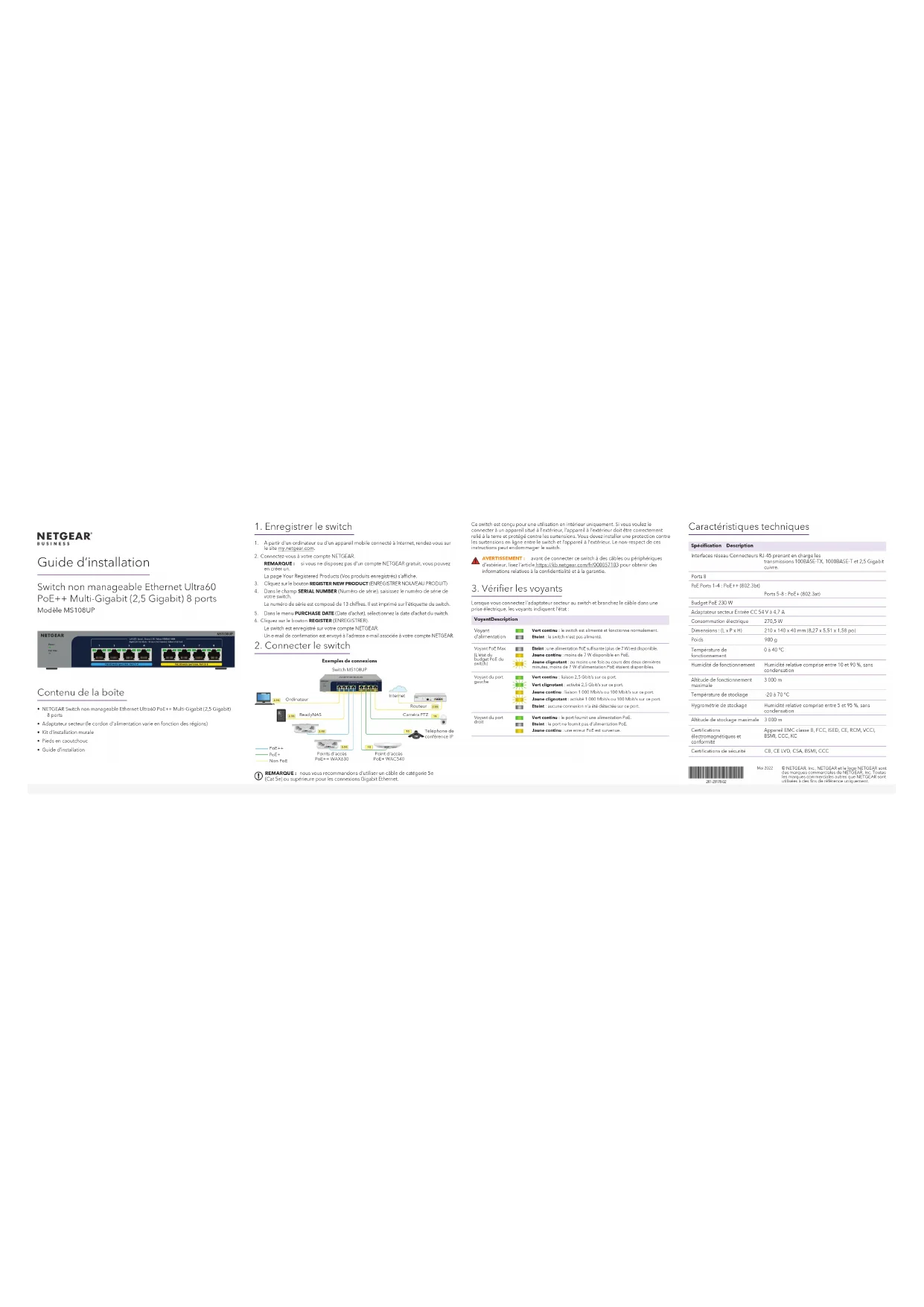 Guide d’installation Mai2022© NETGEAR, Inc., NETGEAR et le logo NETGEAR sont des marques commerciales de NETGEAR, Inc. Toutes les marques commerciales autres que NETGEAR sont utilisées à des ns de référence uniquement. Switch non manageable Ethernet Ultra60 PoE++ Multi-Gigabit (2,5Gigabit) 8ports Modèle MS108UP Contenu de la boîte