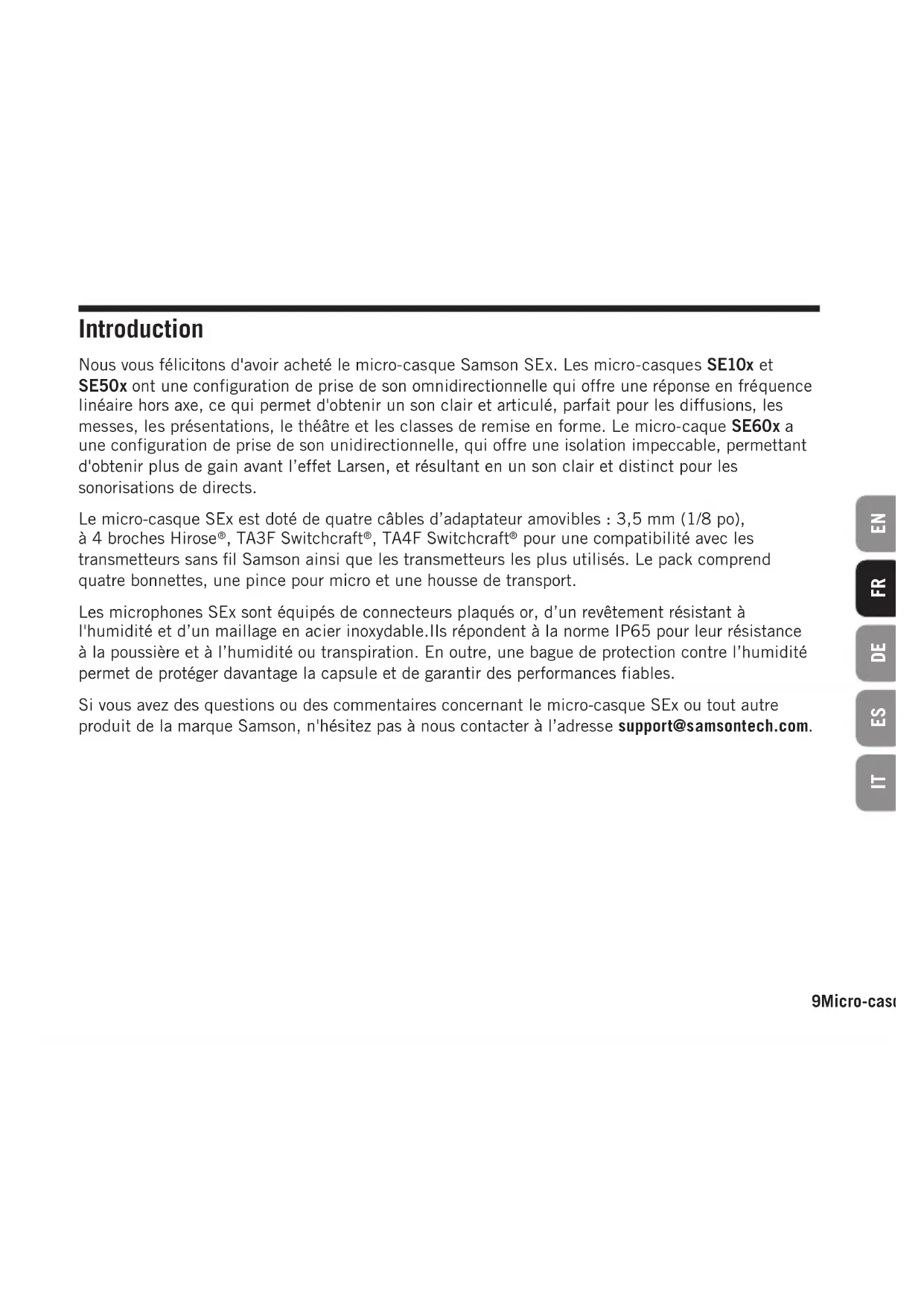 09Micro-casques SE10x/SE50x/SE60x ENFRDEESIT Introduction Nous vous félicitons d'avoir acheté le micro-casque Samson SEx. Les micro-casques SE10x et SE50x ont une configuration de prise de son omnidirectionnelle qui offre une réponse en fréquence linéaire hors axe, ce qui permet d'obtenir un son clair et articulé, parfait pour les diffusions, les messes, les présentations, le théâtre et les classes de remise en forme. Le micro-caque SE60x a une configuration de prise de son unidirectionnelle, qui offre une isolation impeccable, permettant d'obtenir plus de gain avant l’effet Larsen, et résultant en un son clair et distinct pour les sonorisations de directs. Le micro-casque SEx est doté de quatre câbles d’adaptateur amovibles: 3,5 mm (1/8po), à 4 broches Hirose