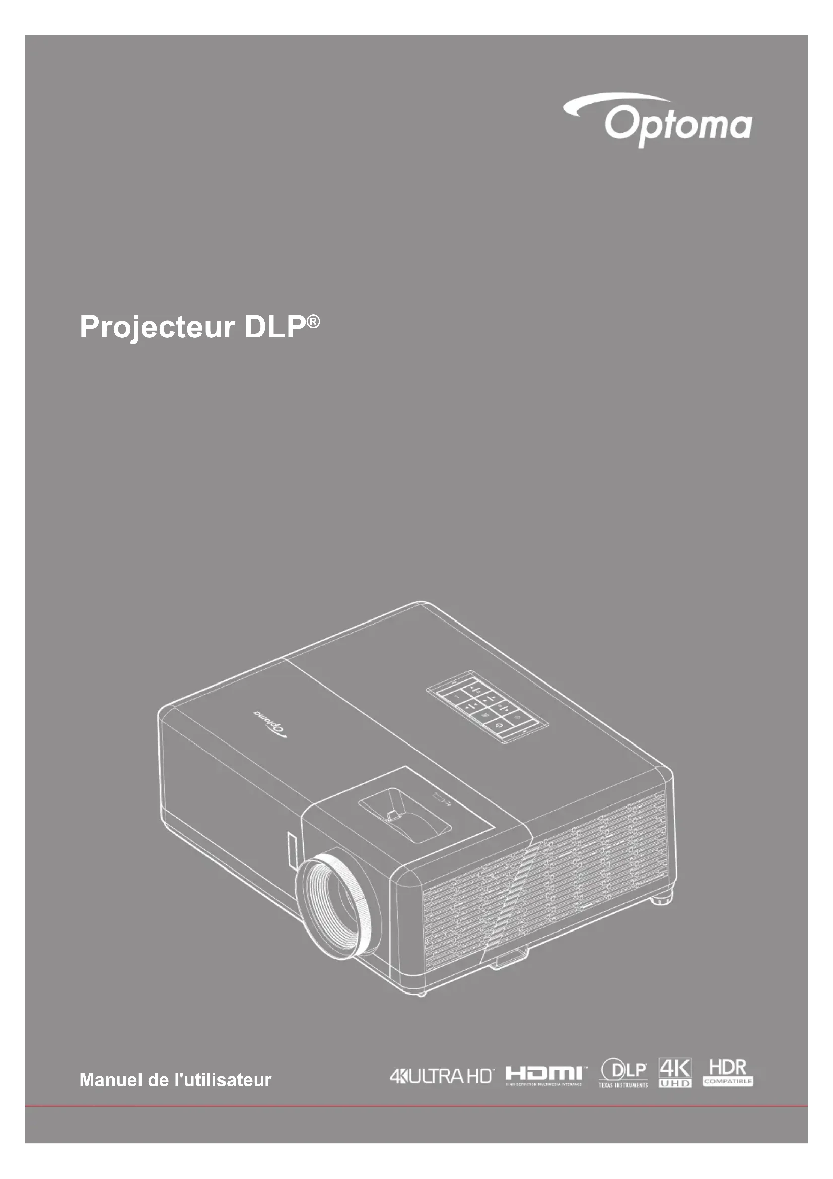 INTRODUCTION Nous vous remercions d'avoir acheté ce projecteur 4K UHD Optoma. Pour obtenir la liste complète des caractéristiques, veuillez consulter la page du produit sur notre site Web, où vous trouverez également des informations et de la documentation supplémentaires telles que la conguration de la commande vocale et les FAQ. Contenu du paquet Déballez avec précaution et vériez que vous avez les éléments suivants en plus des accessoires standard. Certains des éléments pour des accessoires en option peuvent ne pas être disponibles en fonction du modèle, de la spécication et de votre région d'achat. Consultez votre point de vente à ce sujet. Certains accessoires peuvent varier d'une région à l'autre. La carte de garantie n'est fournie que dans certaines régions. Consultez votre revendeur pour plus d'informations. Télécommande IR Fiche d’alimentationProjecteur Documentation